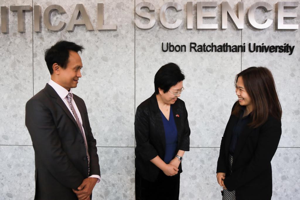 เพื่อส่งเสริมความสัมพันธ์อันดีระหว่างสถานกงสุลใหญ่ฯ และสถาบันการศึกษา โดยได้มีการแลกเปลี่ยนข้อมูลและหารือกับ ดร.ธนเชษฐ วิสัยจร รก.หัวหน้าภาควิชาการเมืองและความสัมพันธ์ระหว่างประเทศ และ ดร.ฐิติพล ภักดีวานิช อาจารย์ประจำภาควิชาการเมืองและความสัมพันธ์ระหว่างประเทศ คณะรัฐศาสตร์ มหาวิทยาลัยอุบลราชธานีร่วมกันในประเด็นเกี่ยวกับสถานการณ์ในประเทศไทย รวมถึงประเด็นสำคัญที่เกี่ยวข้องในภูมิภาค เพื่อสร้างความเข้าใจและขยายความร่วมมือทางวิชาการระหว่างไทยและจีนให้แน่นแฟ้นยิ่งขึ้น