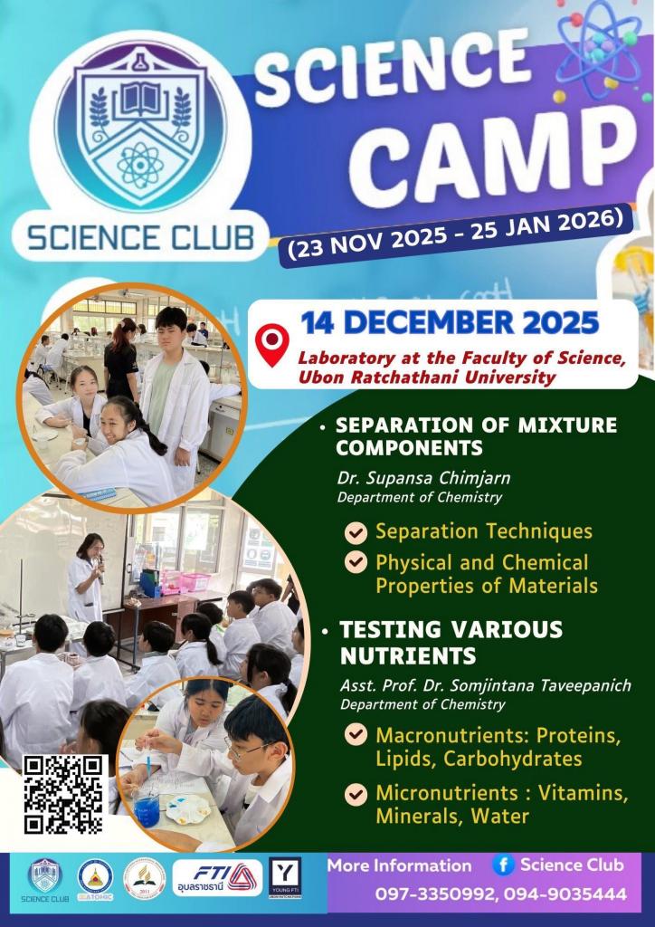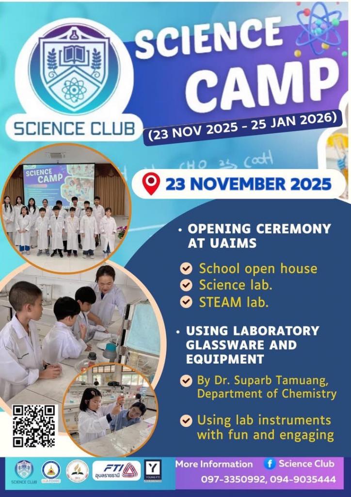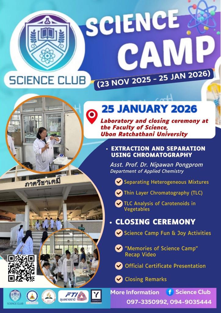สำหรับโครงการ Science Campนี้ จัดขึ้นเป็นครั้งแรก โดยเกิดจากความร่วมมือของ 3 องค์กร คือ คณะวิทยาศาสตร์ มหาวิทยาลัยอุบลราชธานี, โรงเรียนนานาชาติแอดแวนติสมิชชั่นอุบล (Ubon Adventist International Mission School - UAIMS) และสภาอุตสาหกรรมจังหวัดอุบลราชธานี เพื่อร่วมกันปูพื้นฐานและสร้างแรงบันดาลใจด้านวิทยาศาสตร์ให้กับเยาวชนในภาคตะวันออกเฉียงเหนือตอนล่าง ซึ่งตลอดโครงการที่ผ่านมา (23 พฤศจิกายน 2568 - 25 มกราคม 2569) น้อง ๆ ได้เรียนรู้ผ่านประสบการณ์จริงในห้องปฏิบัติการด้วยภาษาอังกฤษ 100% ครอบคลุมกว่า 10หัวข้อการเรียนรู้ และความประทับใจตลอด 2 เดือนที่ผ่านมา