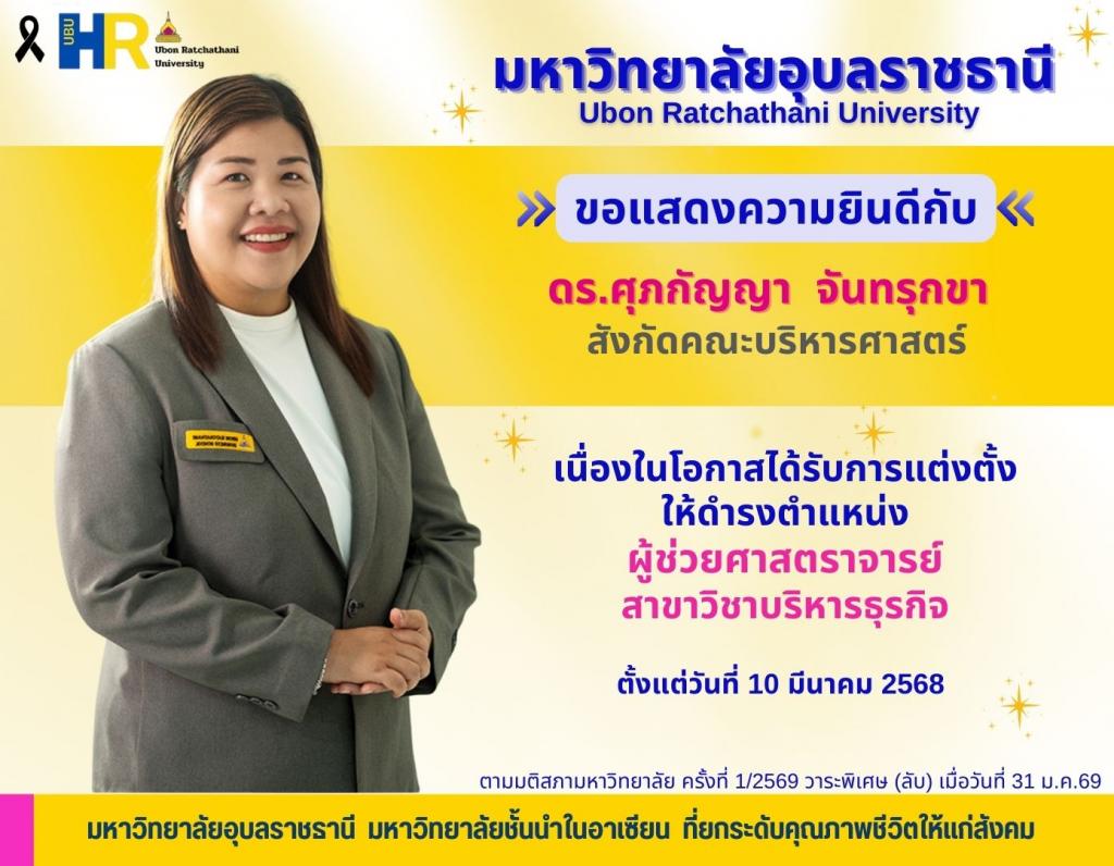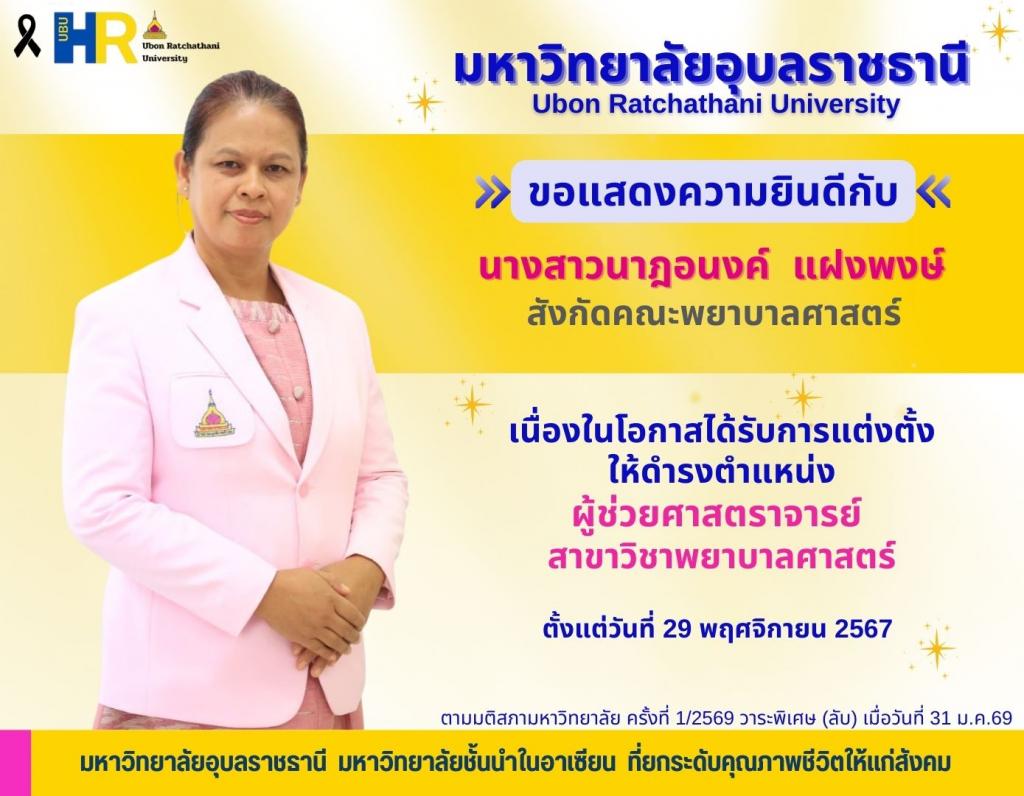 มหาวิทยาลัยอุบลราชธานี ขอแสดงความยินดีเนื่องในโอกาสที่ได้รับการอนุมัติแต่งตั้งให้ดำรงตำแหน่งทางวิชาการ
