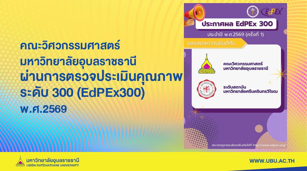 ในการนี้ สป.อว. ขอเรียนว่าคณะอนุกรรมการดำเนินงานโครงการพัฒนาคุณภาพการศึกษาสู่ความเป็นเลิศด้วยเกณฑ์คุณภาพการศึกษาเพื่อการดำเนินการที่เป็นเลิศ (Education Criteria for Performance Excellence : EdPEx) ในการประชุมครั้งที่ 1/2569 เมื่อวันที่ 23 กุมภาพันธ์ 2569 มีมติเห็นชอบให้ประกาศรายชื่อหน่วยงานที่ผ่านการตรวจประเมินคุณภาพระดับ 300 คะแนน (EdPEx300) จำนวน 2 หน่วยงาน ดังต่อไปนี้ คณะวิศวกรรมศาสตร์ มหาวิทยาลัยอุบลราชธานี และ ระดับสถาบันมหาวิทยาลัยศรีนครินทรวิโรฒ