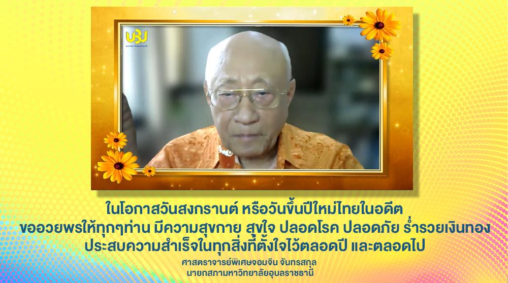 ศาสตราจารย์ (พิเศษ)จอมจิน จันทรสกุล นายกสภามหาวิทยาลัยอุบลราชธานี อวยพรเนื่องในโอกาสพิเศษ วันสงกรานต์ หรือวันขึ้นปีใหม่ไทยในอดีต ขอให้ทุกๆท่าน มีความสุขกาย สุขใจ ปลอดโรค ปลอดภัย ร่ำรวยเงินทอง ประสบความสำเร็จในทุกสิ่งที่ตั้งใจไว้ตลอดปี และตลอดไป