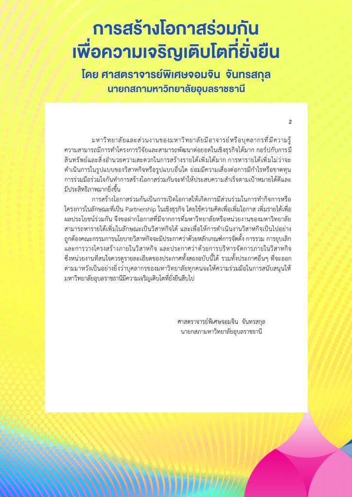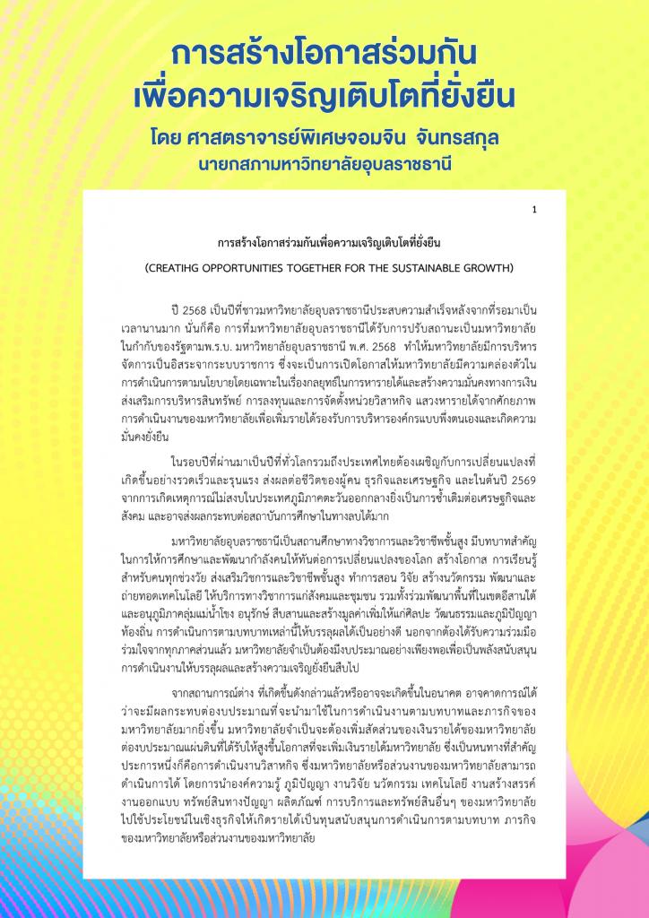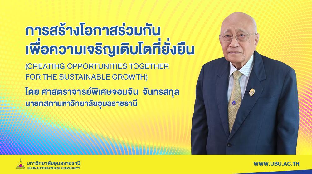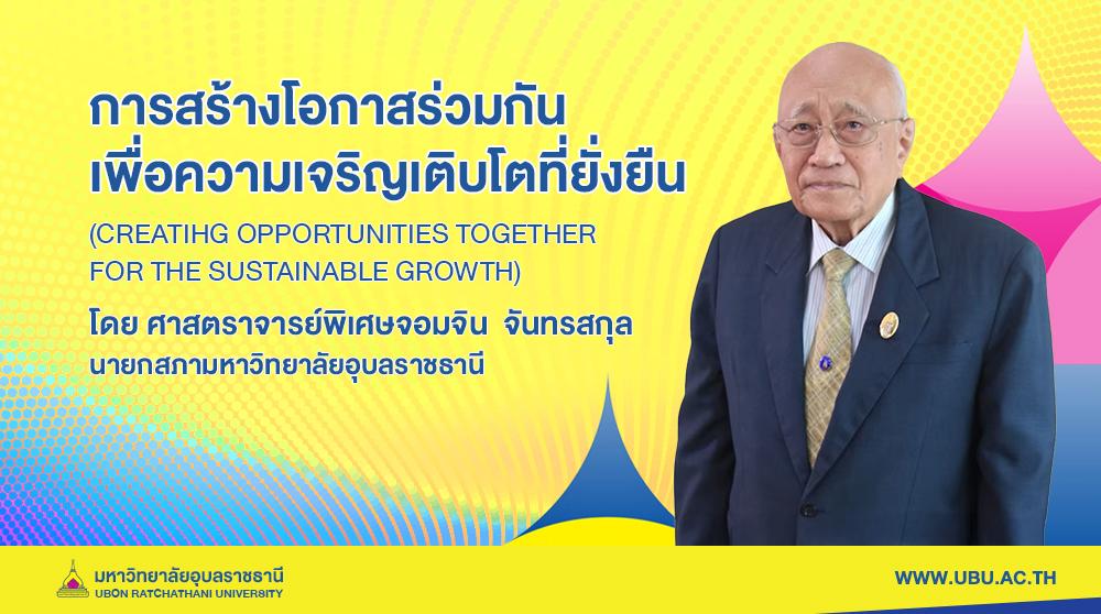 สารจาก ศาสตราจารย์พิเศษจอมจิน จันทรสกุล นายกสภามหาวิทยาลัยอุบลราชธานี การสร้างโอกาสร่วมกันเพื่อความเจริญเติบโตที่ยั่งยืน