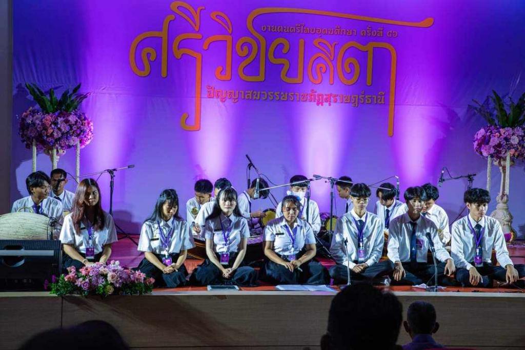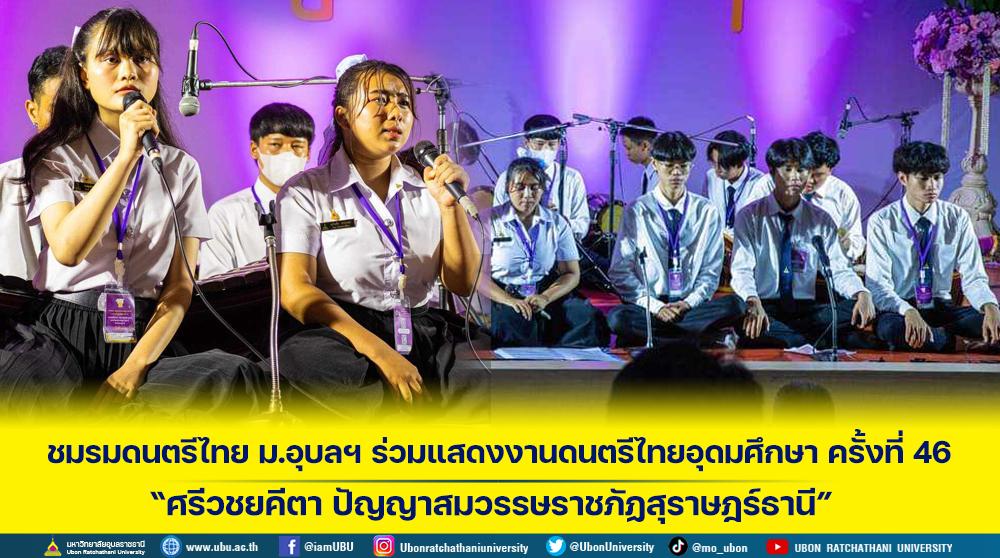มหาวิทยาลัย?อุบล?ราชธานี โดยชมรมดนตรี?ไทย??เข้าร่วมงาน ดนตรีไทยอุดมศึกษา ครั้งที่ 46 “ศรีวชยคีตา ปัญญาสมวรรษราชภัฏสุราษฎร์ธานี” เพื่อร่วมแลกเปลี่ยนเรียนรู้ประสบการณ์ด้านดนตรีไทยของสถาบันอุดมศึกษาและร่วมกันอนุรักษ์เผยแพร่ดนตรีไทย โดยมี อาจารย์มิตต ทรัพย์ผุด และอาจารย์พัน พงษ์ผล อาจารย์ผู้ฝึกซ้อม/ควบคุมวงฯ พร้อมด้วยนักศึกษา?ชมรมดนตรีไทย จำนวน 18 คน เข้าร่วม ซึ่งมีสถาบันเข้าร่วมทั้งหมด 112 สถาบัน ณ มหาวิทยาลัยราชภัฏสุราษฎร์ธานี ระหว่างวันที่ 23-25 กรกฎาคม 2566 ที่ผ่านมา