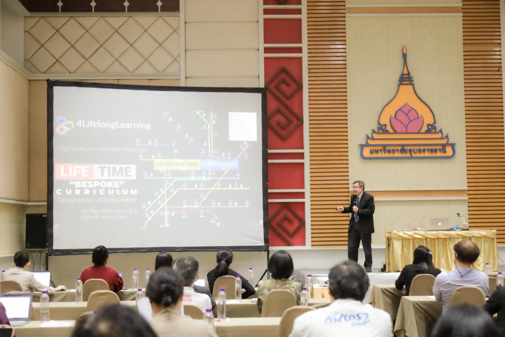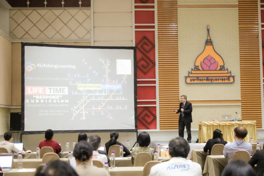 มหาวิทยาลัยอุบลราชธานี โดยงานมาตรฐานและพัฒนาหลักสูตร กองบริการการศึกษา จัดโครงการอบรมเชิงปฏิบัติการ การศึกษาแบบ Micro-credentials เพื่อพัฒนาสมรรถนะบัณฑิตรับรองการเปลี่ยนแปลงในปัจจุบันและอนาคต โดยมี ผู้ช่วยศาสตราจารย์ ดร.ชุตินันท์ ประสิทธิ์ภูริปรีชา รักษาราชการแทนอธิการบดี เป็นประธานกล่าวเปิดงาน และนางวิชชุดา มงคล รักษาการในตำแหน่งผู้อำนวยการกองบริการการศึกษา กล่าวรายงาน รับเกียรติจาก รองศาสตราจารย์ ดร. บัณฑิต ทิพากร ที่ปรึกษาอธิการบดีด้านนวัตกรรมการเรียนรู้ มหาวิทยาลัยเทคโนโลยีพระจอมเกล้าธนบุรี เป็นวิทยากรบรรยาย หัวข้อ การเปลี่ยนแปลงการอุดมศึกษาในปัจจุบันและอนาคต การพัฒนาหลักสูตรแบบ Micro-credentialsและเพื่อพัฒนาสมรรถนะบัณฑิต มีผู้เข้าอบรมจำนวน 100 คน ณ โรงแรมยูเพลส เมื่อวันที่ 27 กันยายน 2566 ที่ผ่านมา
