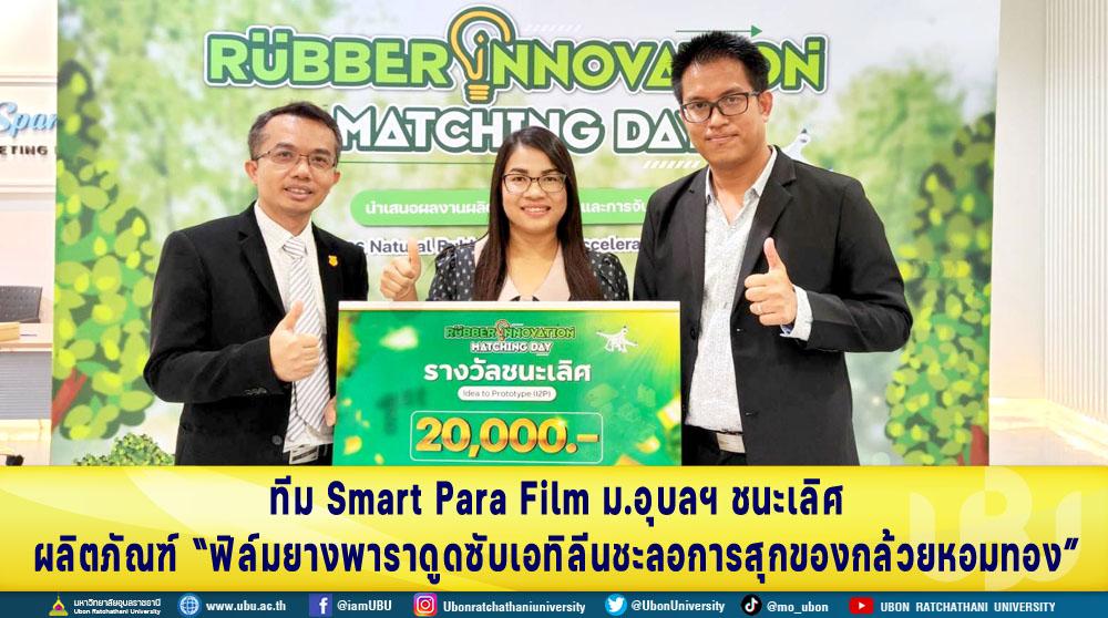 สำหรับทีม Smart Para Film ที่สร้างชื่อเสียงและผลงานเป็นที่ประจักษ์ สร้างความภาคภูมิใจให้แก่มหาวิทยาลัยอุบลราชธานีครั้งนี้ จากผลิตภัณฑ์ “ฟิล์มยางพาราดูดซับเอทิลีนชะลอการสุกของกล้วยหอมทอง” ซึ่งพัฒนาโดย ผู้ช่วยศาสตราจารย์ ดร.ปราณี นุ้ยหนู ผู้ช่วยศาสตราจารย์ ดร.สราวุธ ประเสริฐศรี รองศาสตราจารย์ ดร.สายันต์ แสงสุวรรณ อาจารย์ประจำสาขาเทคโนโลยียางและพอลิเมอร์ ภาควิชาเคมี คณะวิทยาศาสตร์ และ รองศาสตราจารย์ ดร.วีรเวทย์ อุทโธ อาจารย์ประจำสาขาวิชาอุตสาหกรรมเกษตร คณะเกษตรศาสตร์ มหาวิทยาลัยอุบลราชธานี โดยทีมอาจารย์ที่เข้าร่วมการแข่งขันแบ่งผลงานเป็น 4 ระดับ ได้แก่ ผลงานระดับ Product to Global Market (P2GM) การพัฒนาผลิตภัณฑ์ยางพาราที่อยู่ในตลาดเพื่อเข้าสู่ตลาดต่างประเทศ ผลงานระดับ Product to Market (P2M) การพัฒนาผลิตภัณฑ์ต้นแบบยางพาราเข้าสู่ตลาด ผลงานระดับ Idea to Prototype (I2P) การมีไอเดีย/แนวคิดธุรกิจเพื่อพัฒนาสู่ผลิตภัณฑ์ต้นแบบยางพารา และผลงานระดับ Design Contest (I2D) การสร้างสรรค์ผลิตภัณฑ์จากวัสดุสานยางธรรมชาติเทอร์โมพลาสติก ให้เป็นผลิตภัณฑ์ใหม่ที่มีคุณค่าและมีมูลค่าเพิ่ม