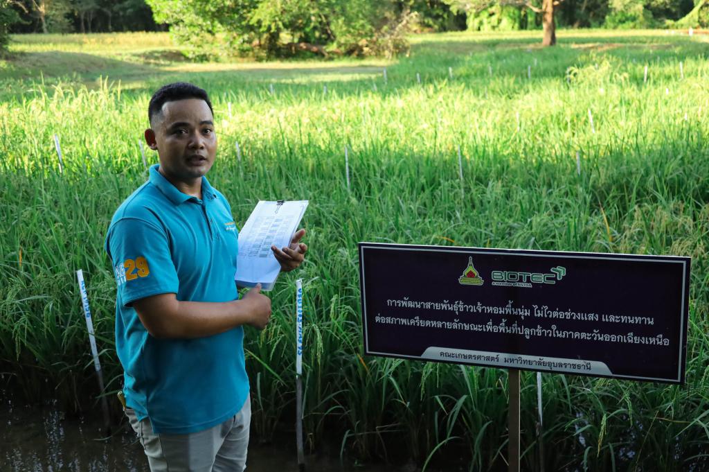 รองศาสตราจารย์ ดร.สุรีพร เกตุงาม หัวหน้านักวิจัย กล่าวว่า คณะเกษศาสตร์ได้พัฒนาสายพันธุ์ข้าวที่หลากหลายมาอย่างต่อเนื่อง อาทิ งานวิจัยการพัฒนาสายพันธุ์ข้าวเจ้าหอมพื้นนุ่ม ไม่ไวต่อช่วงแสงและทนทานต่อสภาพเครียดหลายลักษณะเพื่อพื้นที่ปลูกข้าวในภาคตะวันออกเฉียงเหนือ แปลงขยายเมล็ดพันธุ์ข้าวเจ้าหอมวาริน แปลงทดลองการพัฒนาข้าวเจ้าหอมสายพันธุ์ปรับปรุงรองรับสภาพแวดล้อมวิกฤต แปลงพันธุ์ข้าวเจ้าหอมวาริน ซึ่งมีคุณสมบัติที่โดดเด่น สามารถตอบโจทย์เกษตรกรในพื้นที่ภาคอีสานได้เป็นอย่างดี มีการปรับปรุงสายพันธุ์ข้าว สามารถทนน้ำท่วมฉับพลัน ทนเเล้ง ต้านทานโรคไหม้ ให้ผลผลิตสูง ปรับตัวได้ดีในพื้นที่ปลูกข้าว อาศัยน้ำฝนในภาคตะวันออกเฉียงเหนือ ข้าวสุกมีกลิ่นหอม และมีความนุ่มเหนียวคล้ายข้าวดอกมะลิ 105