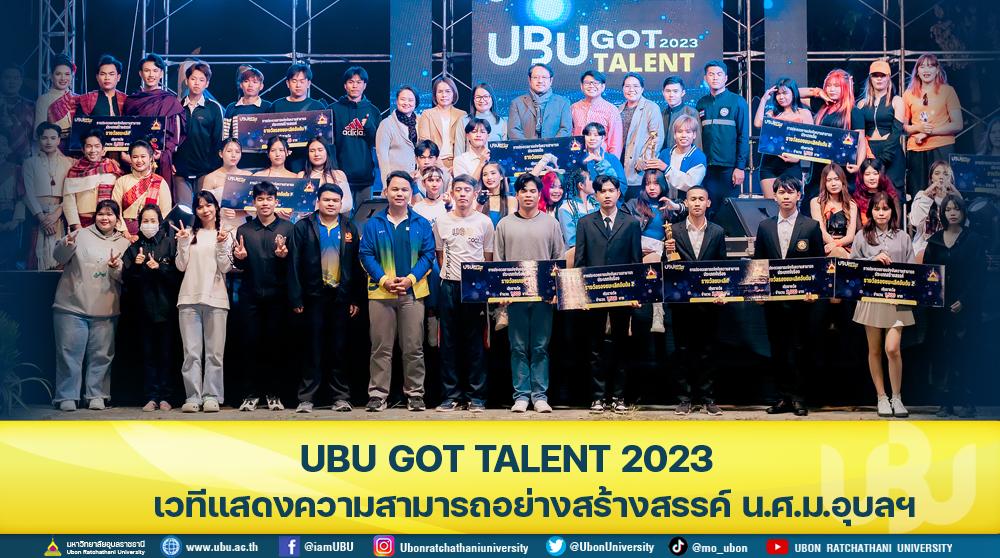 กิจกรรม UBU GOT TALENT 2023นับเป็นอีกหนึ่งโครงการที่เปิดโอกาสให้นักศึกษามหาวิทยาลัยอุบลราชธานี ทั้ง 10คณะ 1วิทยาลัย ที่มีความสามารถหลากหลาย ได้แสดงออกอย่างสร้างสรรค์ ผ่านการขับร้อง การเต้น และกิจกรรมสร้างสรรค์ โดยผลการประกวด UBU GOT TALENT 2023ประเภทขับร้อง รางวัลชนะเลิศ ได้แก่ นายเจษฎาพงษ์ พวงจันทร์ นักศึกษาคณะศิลปศาสตร์ ประเภทเต้น รางวัลชนะเลิศ ได้แก่ ทีม เยาวรุ่น y2k ประเภทสร้างสรรค์ รางวัลชนะเลิศ ได้แก่ ทีมโหง่ย