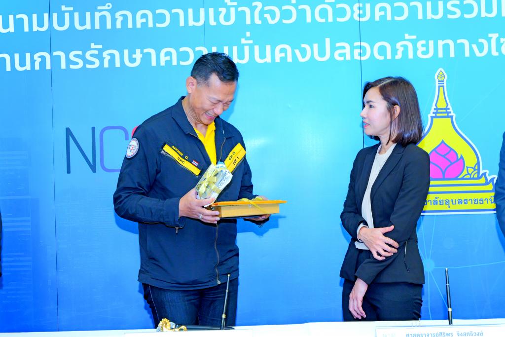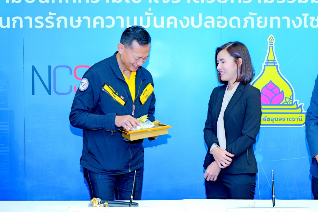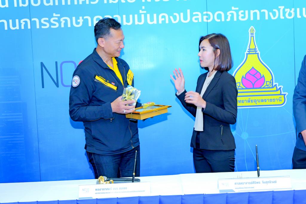 ศาสตราจารย์ ดร.ศิริพร จึงสุทธิวงษ์ คณบดีคณะวิทยาศาสตร์ กล่าวว่า มหาวิทยาลัยอุบลราชธานี โดยคณะวิทยาศาสตร์ได้เปิดหลักสูตรด้านเทคโนโลยีดิจิทัล ได้แก่ วิทยาศาสตรมหาบัณฑิต สาขาวิชาเทคโนโลยีสารสนเทศและนวัตกรรมดิจิทัล หลักสูตรวิทยาศาสตรบัณฑิตสาขาวิทยาการข้อมูลและนวัตกรรมซอฟท์แวร์ และหลักสูตรวิทยาศาสตรบัณฑิตสาขาเทคโนโลยีสารสนเทศและการสื่อสาร โดยสาขาเทคโนโลยีสารสนเทศและการสื่อสารมีสามแขนงวิชาคือ แขนงวิชาเทคโนโลยีเครือข่ายและความมั่นคงทางไซเบอร์ แขนงวิชาเทคโนโลยีดิจิทัล แขนงวิชาเทคโนโลยีเกมและดิจิทัลคอนเทนต์ ทั้งนี้ การจัดทำบันทึกความเข้าใจด้านการส่งเสริมการพัฒนาทักษะการรักษาความมั่นคงปลอดภัยทางไซเบอร์ระหว่างสำนักงานคณะกรรมการการรักษาความมั่นคงปลอดภัยไซเบอร์แห่งชาติกับมหาวิทยาลัยอุบลราชธานีในครั้งนี้ จะช่วยส่งเสริมการผลิตกำลังคนด้านเทคโนโลยีดิจิทัลและความมั่นคงปลอดภัยไซเบอร์ซึ่งกำลังขาดแคลน ช่วยพัฒนาบุคลากรด้านการศึกษาให้มีความพร้อมต่อการถ่ายทอดองค์ความรู้พร้อมดำเนินการขยายผลการพัฒนากลุ่มเป้าหมายให้มีสมรรถนะด้านความมั่นคงปลอดภัยไซเบอร์ในระดับสากล และช่วยพัฒนาองค์ความรู้เกี่ยวกับการรักษาความมั่นคงปลอดภัยไซเบอร์ เพื่อยกระดับทักษะความเชี่ยวชาญในการปฏิบัติหน้าที่เกี่ยวกับการรักษาความมั่นคงปลอดภัยไซเบอร์ ในกลุ่มเป้าหมาย สู่การเป็นศูนย์กลางการแลกเปลี่ยนเรียนรู้ ติดตาม วิเคราะห์ และประมวลผลข้อมูลเกี่ยวกับภัยคุกคามทางไซเบอร์ และการแจ้งเตือนเกี่ยวกับภัยคุกคามทางไซเบอร์ ในพื้นที่อีสานใต้