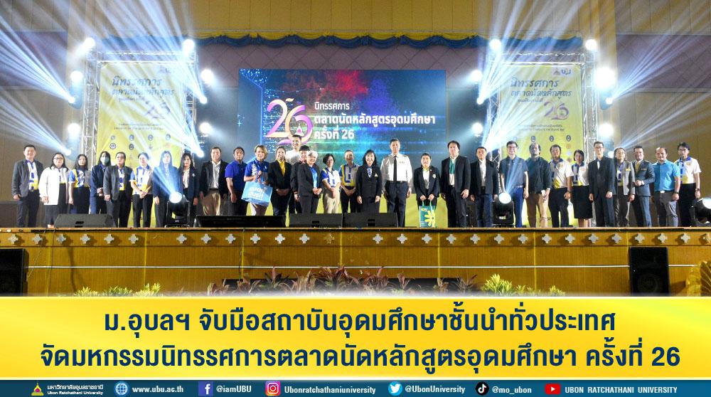 มหาวิทยาลัยอุบลราชธานี ร่วมกับ สมาคมที่ประชุมอธิการบดีแห่งประเทศไทย และสถาบันการศึกษาทั้งภาครัฐและเอกชน จัด “นิทรรศการตลาดนัดหลักสูตรระดับอุดมศึกษา” ครั้งที่ 26 ระหว่างวันที่ 11 - 12 กรกฎาคม 2567 ณ มหาวิทยาลัยอุบลราชธานี “Education for Change in the Digital age” โดยมี รองศาสตราจารย์ ดร.ชุตินันท์ ประสิทธิ์ภูริปรีชา อธิการบดีมหาวิทยาลัยอุบลราชธานี เป็นประธานและกล่าวต้อนรับนักเรียน นิสิตนักศึกษา ครู ผู้ปกครอง หน่วยงานและผู้สนใจเข้าชมนิทรรศการตลาดนัดหลักสูตรระดับอุดมศึกษา สำหรับในครั้งนี้มีมหาวิทยาลัยทั้งภาครัฐและเอกชนร่วมออกบูธนิทรรศการ 87 บูท จาก 62 มหาวิทยาลัย โดยแบ่งเป็นมหาวิทยาลัยภาครัฐ 32 แห่ง มหาวิทยาลัยเอกชน 30 แห่ง เพื่อประชาสัมพันธ์เผยแพร่ข้อมูลการศึกษาต่อตลอดจนหลักสูตรที่เปิดสอนในระดับอุดมศึกษาทั่วประเทศ ให้แก่นักเรียนชั้นมัธยมศึกษาตอนปลาย ครูแนะแนว ผู้ปกครอง และนักศึกษาที่สนใจเข้าร่วมชมนิทรรศการ ณ อาคารเฉลิมพระเกียรติ 7รอบพระชนมพรรษา มหาวิทยาลัยอุบลราชธานี