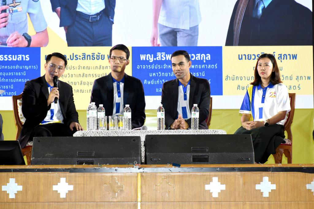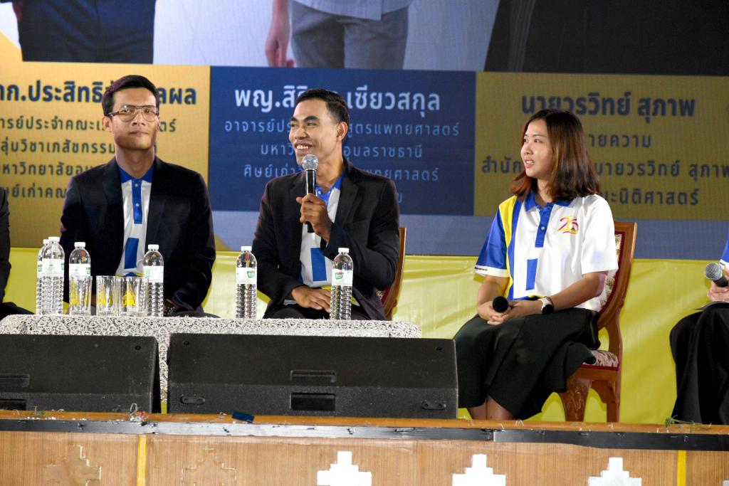 รองศาสตราจารย์ ดร.ชุตินันท์ ประสิทธิ์ภูริปรีชา อธิการบดีมหาวิทยาลัยอุบลราชธานี กล่าวว่า ตามที่สำนักงานคณะกรรมการการอุดมศึกษาร่วมกับสถาบันอุดมศึกษาทั่วประเทศได้จัดโครงการนิทรรศการตลาดนัดหลักสูตรอุดมศึกษาในพื้นที่เขตภาคกลางที่กรุงเทพมหานครและส่วนภูมิภาคโดยมหาวิทยาลัยอุบลราชธานีเข้าร่วมเป็นเจ้าภาพ ทั้งนี้ เพื่อประชาสัมพันธ์เผยแพร่ข้อมูลทางการศึกษาให้แก่นักเรียนชั้นมัธยมศึกษาตอนปลาย ครู ผู้ปกครอง รวมทั้งผู้สนใจทั่วไป เกี่ยวกับการสอบคัดเลือกเข้าศึกษาในสถาบันอุดมศึกษาทั้งโดยวิธีการสอบคัดเลือกผ่านสำนักงานคณะกรรมการการอุดมศึกษา ได้รู้จักและทราบรายละเอียดเกี่ยวกับสาขาวิชา การเรียนการสอนของคณะวิชาต่าง ๆ อย่างชัดเจนทั้งหลักสูตรภาษาไทย ภาษาอังกฤษ และนานาชาติและการสอบคัดเลือกในโครงการส่งเสริมโอกาสการศึกษาต่อ (โควตาพิเศษ) และโครงการพิเศษต่าง ๆ ของคณะและมหาวิทยาลัยและสอดคล้องกับทิศทางและแผนการพัฒนาการศึกษาระดับอุดมศึกษา ฉบับที่ 11 คือการกระจายโอกาสในการรับทราบข้อมูลการศึกษาให้ทั่วถึงทั้งในส่วนกลางและส่วนภูมิภาค ทั้งนี้ ภายในงานกำหนดให้มีการเสวนาพิเศษ เรื่อง “พี่ศิษย์เก่า เล่าให้น้องฟัง” โดย พญ.สิริพร เซียวสกุล อาจารย์ประจำหลักสูตรแพทยศาสตร์ มหาวิทยาลัยอุบลราชธานี ศิษย์เก่าวิทยาลัยแพทยศาสตร์และการสาธารณสุข ผู้ช่วยศาสตราจารย์ ภก.ประสิทธิชัย พูลผล อาจารย์ประจำคณะเภสัชศาสตร์ กลุ่มวิชาเภสัชกรรมปฏิบัติ ศิษย์เก่าคณะเภสัชศาสตร์ ดร.กวิณกุล ธรรมสาร ปลัดอำเภอ (เจ้าพนักงานปกครองชำนาญการ) ผู้ช่วยป้องกันจังหวัดอุบลราชธานี กลุ่มงานความมั่งคง ที่ทำการปกครองจังหวัดอุบลราชธานี ศิษย์เก่าคณะรัฐศาสตร์ และนายวรวิทย์ สุภาพ ทนายความ สำนักงานกฎหมายวรวิทย์ สุภาพ ศิษย์เก่าคณะนิติศาสตร์ ให้เกียรติร่วมวงเสวนา จากนั้น เป็นการแนะนำ คณะ/หลักสูตร ภายในมหาวิทยาลัยอุบลราชธานี ได้แก่ คณะวิทยาศาสตร์ คณะเกษตรศาสตร์ คณะวิศวกรรมศาสตร์ คณะศิลปศาสตร์ คณะเภสัชศาสตร์ คณะบริหารศาสตร์ วิทยาลัยแพทยศาสตร์และการสาธารณสุข คณะศิลปประยุกต์และสถาปัตยกรรมศาสตร์ คณะนิติศาสตร์ คณะรัฐศาสตร์ และคณะพยาบาลศาสตร์ พร้อมทั้งกิจกรรม ถาม - ตอบ มอบรางวัลและกิจกรรมนันทนาการจากผู้แทนสถาบันต่าง ๆ กิจกรรมแนะนำมหาวิทยาลัยอุบลราชธานี หลักสูตร การเรียนการสอน โดยตัวแทนจากคณะ/หลักสูตรในมหาวิทยาลัยอุบลราชธานี และจากสถาบันต่าง ๆ พร้อมแจกรางวัลตลอดการจัดกิจกรรม