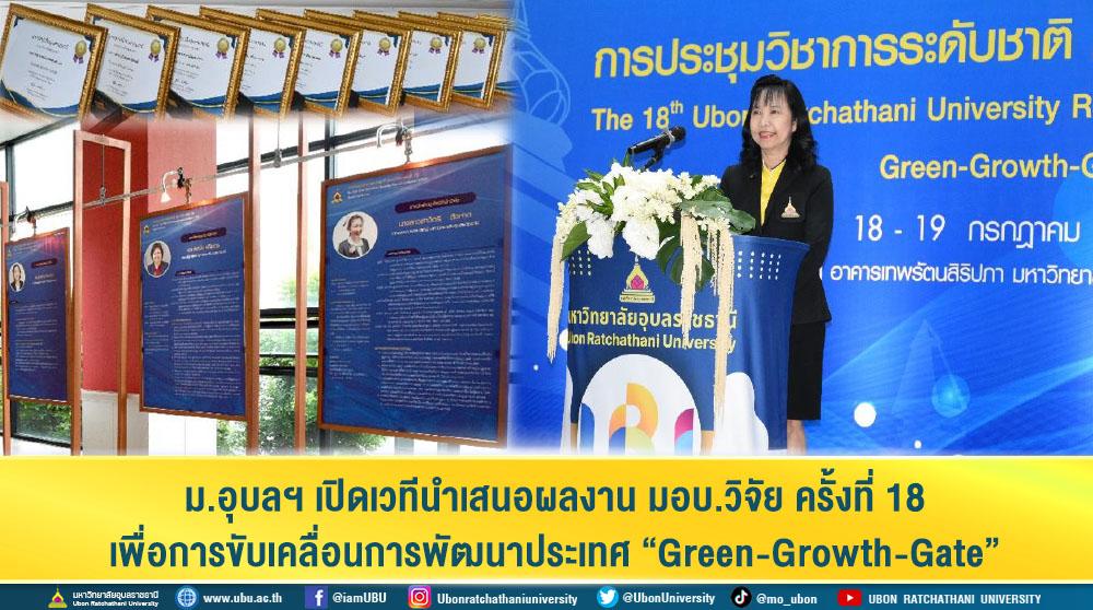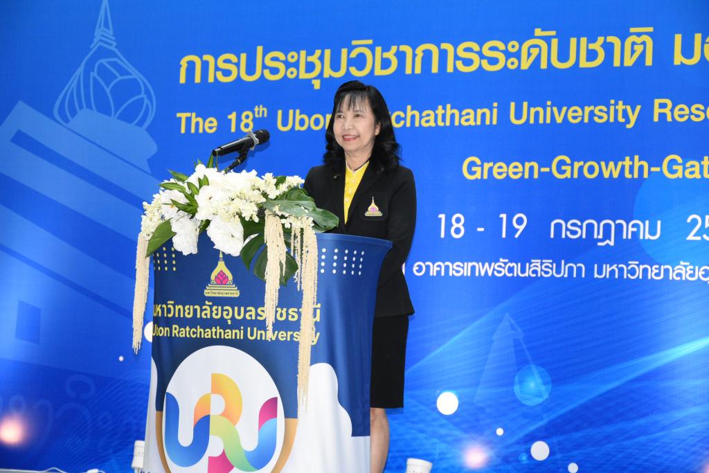 มหาวิทยาลัยอุบลราชธานี โดย สำนักงานส่งเสริมบริหารงานวิจัย บริการวิชาการและทำนุบำรุงศิลปวัฒนธรรม จัดการประชุมวิชาการระดับชาติ มอบ.วิจัย ครั้งที่ 18 ระหว่างวันที่ 18 - 19 กรกฎาคม 2567 ณ โรงแรมยูเพลส ภายใต้หัวข้อ “Green-Growth-Gate” โดยมี รองศาสตราจารย์ ดร.ชุตินันท์ ประสิทธิ์ภูริปรีชา อธิการบดี เป็นประธาน และศาสตราจารย์ ดร.ทวนทอง จุฑาเกตุ รองอธิการบดีฝ่ายวิจัยและนวัตกรรม กล่าวรายงานและวัตถุประสงค์การจัดประชุมวิชาการระดับชาติครั้งนี้ เพื่อเป็นเวทีนำเสนอผลงานวิจัยของคณาจารย์ นักวิจัย และนักศึกษา รวมทั้งนำเสนอกิจกรรมการวิจัยที่เกิดจากความร่วมมือทางวิชาการของมหาวิทยาลัยอุบลราชธานี และหน่วยงานภายนอก และเพื่อให้เกิดการพบปะแลกเปลี่ยนองค์ความรู้ระหว่างนักวิจัยในสาขาต่าง ๆ ตลอดจนกระตุ้นและสร้างบรรยากาศการวิจัยในมหาวิทยาลัย เกิดการสร้างนักวิจัยรุ่นใหม่และกลุ่มนักวิจัยทั้งในและระหว่างสถาบัน