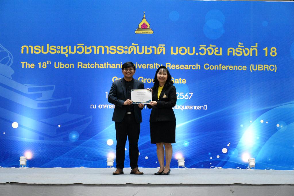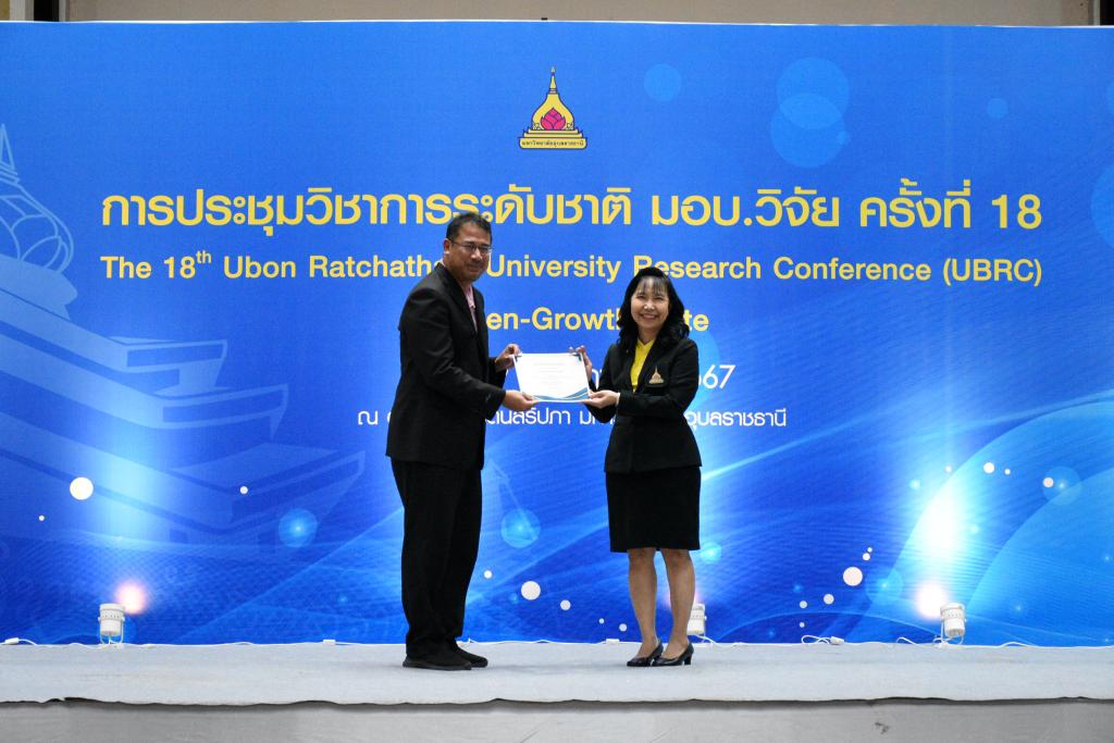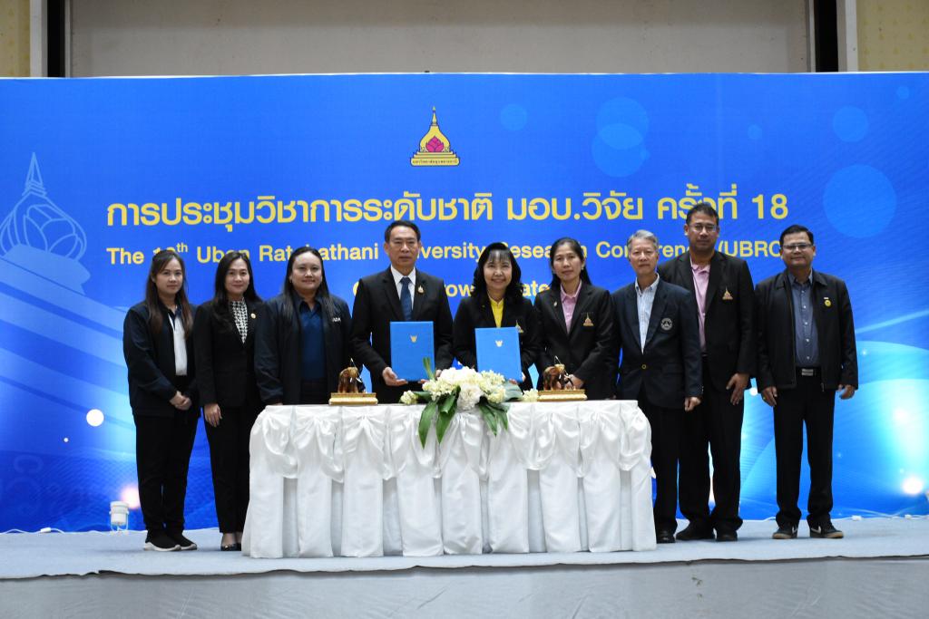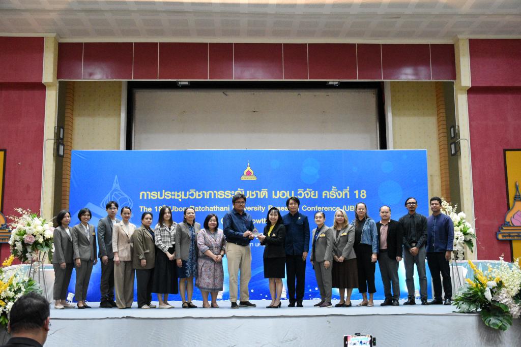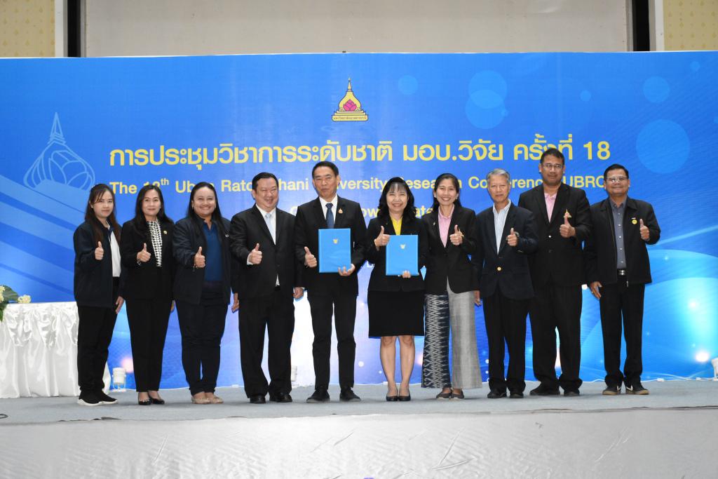 ศาสตราจารย์ ดร.ทวนทอง จุฑาเกตุ รองอธิการบดีฝ่ายวิจัยและนวัตกรรม กล่าวว่า สำหรับการประชุมวิชาการระดับชาติ มอบ.วิจัย ครั้งที่ 18 ภายใต้หัวข้อ “Green-Growth-Gate” เพื่อให้สอดคล้องกับยุทธศาสตร์ อววน. และแผนปฏิบัติการขับเคลื่อนและส่งเสริมการใช้ประโยชน์ด้าน ววน. ระดับภูมิภาค (2567-2570) และแผนยุทธศาสตร์มหาวิทยาลัยอุบลราชธานี โดยการนำเสนอผลงานวิจัยและนวัตกรรมที่จะเป็นทิศทางเพื่อการขับเคลื่อนการพัฒนาประเทศในประเด็นต่อไปนี้ Green – ฐานการผลิตและบริการที่เป็นมิตรกับสิ่งแวดล้อม, Growth – การวิจัยและพัฒนาเพื่อสร้างความเข้มแข็งในการแข่งขันและยกระดับคุณภาพชีวิต และGate – ยกระดับการผลิตและบริการสู่มาตรฐานสากลเพื่อขับเคลื่อนเศรษฐกิจของประเทศ ทั้งนี้ เพื่อเป็นเวทีในการนำเสนอผลงานการวิจัยในระดับอุดมศึกษาของคณาจารย์ นักวิจัย และนักศึกษาในสถาบันอุดมศึกษาต่าง ๆ เพื่อส่งเสริมและสร้างการเรียนรู้ สร้างเครือข่าย และยกระดับงานทางวิชาการมาอย่างต่อเนื่องทุกปี ซึ่งในปีนี้มีผู้เข้าร่วมงานพร้อมผลงานวิจัยที่ผ่านการพิจารณาเข้าร่วมนำเสนอ รวมทั้งสิ้น 54 ผลงาน แบ่งเป็นการนำเสนอแบบบรรยายจำนวน 36 ผลงาน และการนำเสนอแบบโปสเตอร์จำนวน 18 ผลงาน และยังกำหนดให้มีการลงนามความร่วมมือ (MOU) ระหว่างสำนักงานพัฒนาการวิจัยการเกษตร (องค์การมหาชน) กับมหาวิทยาลัยอุบลราชธานี เพื่อส่งเสริม สนับสนุนทุนเพื่อการพัฒนาการวิจัยการเกษตรและบุคลากรด้านการเกษตร การจัดกิจกรรมให้คำปรึกษาคลินิกวิจัยโดยทีมวิทยากรผู้ทรงคุณวุฒิจากสำนักงานพัฒนาการวิจัยการเกษตร (องค์การมหาชน) การจัดนิทรรศการผลงานวิจัยของศูนย์วิจัย กลุ่มวิจัยในมหาวิทยาลัยอุบลราชธานี และการมอบรางวัลให้แก่นักวิจัยของมหาวิทยาลัย โดยมีการมอบรางวัลเชิดชูเกียรตินักวิจัย 10 ท่าน รางวัลนักวิจัยที่มีผลงานดีเด่นและผลงานวิจัยที่ได้รับรางวัล จำนวน 3 รางวัล ได้แก่ รางวัลนักวิจัยระดับ Tier 1 และ Q1 ผู้สร้างสรรค์ผลงานวิจัยตีพิมพ์ในวารสารวิชาการ รางวัลผลงานวิจัยสิ่งประดิษฐ์/นวัตกรรม และรางวัลผลงานวิจัยเพื่อชุมชนท้องถิ่น
