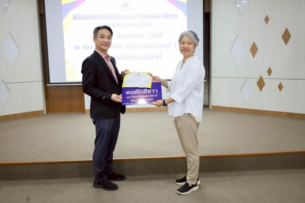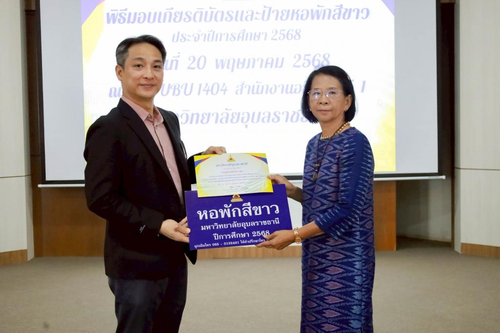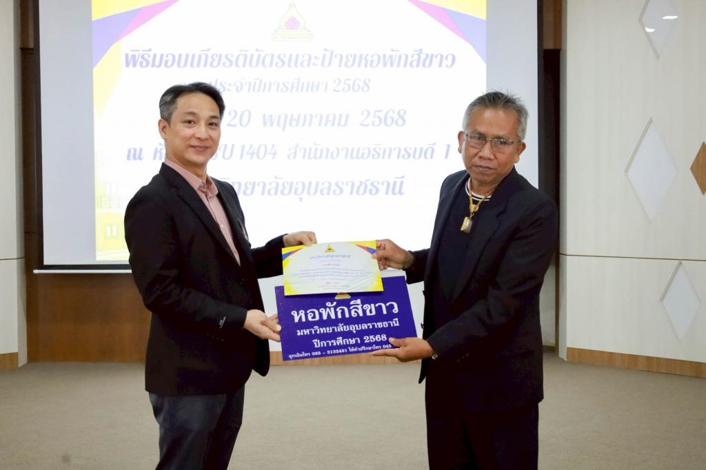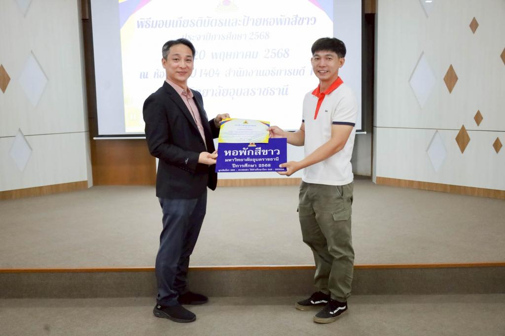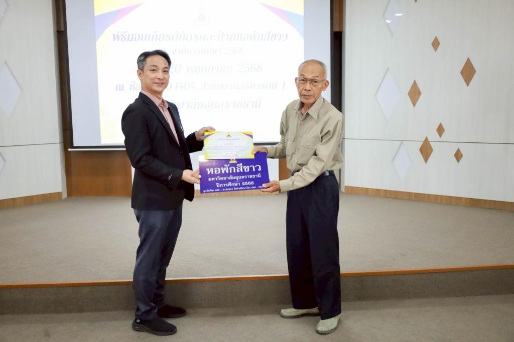 มหาวิทยาลัยอุบลราชธานี โดยงานวินัยและสวัสดิภาพนักศึกษา สำนักงานพัฒนานักศึกษา จัดพิธีมอบเกียรติบัตรและป้ายหอพักสีขาว (เครือข่ายหอพักปลอดภัย ไร้อบายมุขและยาเสพติด) ประจำปีการศึกษา 2568 ให้แก่ หอพักเอกชนโดยรอบมหาวิทยาลัยที่เข้าร่วม จำนวน 46 แห่ง ที่ร่วมโครงการ โดยมี ผู้ช่วยศาสตราจารย์ ดร.ปรีชา บญจูง รองอธิการบดีฝ่ายพัฒนานักศึกษาและศิษย์เก่าสัมพันธ์ เป็นประธานคณะกรรมการดำเนินงานโครงการฯ ตรวจประเมิน ตามข้อกำหนดมาตรฐานของมหาวิทยาลัย รับเกียรติจาก ผู้ช่วยศาสตราจารย์ ดร.เกรียงศักดิ์ แก้วกุลชัย รองอธิการบดีฝ่ายบริหาร เป็นประธานมอบ ณ ห้องประชุม ชั้น 4 อาคารสำนักงานอธิการบดี 1 ในเมื่อวันที่ 20 พฤษภาคม 2568 ที่ผ่านมา