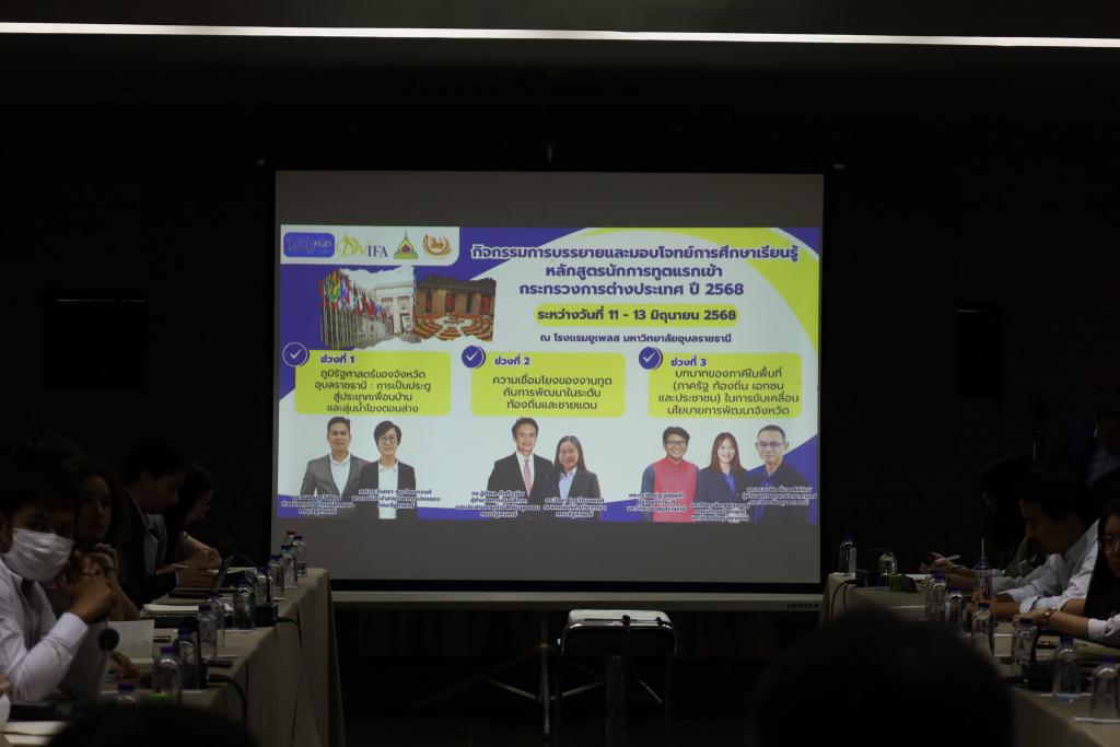 คณะรัฐศาสตร์ มหาวิทยาลัยอุบลราชธานี ร่วมกับ สถาบันการต่างประเทศเทวะวงศ์วโรปการ จัดกิจกรรมการบรรยายและมอบโจทย์การศึกษาเรียนรู้ หลักสูตรนักการทูตแรกเข้า กระทรวงการต่างประเทศ ประจำปี 2568 จำนวน 60 คน ระหว่างวันที่ 11 - 13 มิถุนายน 2568 ณ โรงแรมยูเพลส มหาวิทยาลัยอุบลราชธานี โดยมี ผศ.ดร.เกรียงศักดิ์ แก้วกุลชัย รองอธิการบดีฝ่ายบริหาร กล่าวต้อนรับ ดร.ศิริพร จันทนสกุลวงศ์ คณบดีคณะรัฐศาสตร์ร่วมเป็นเกียรติ