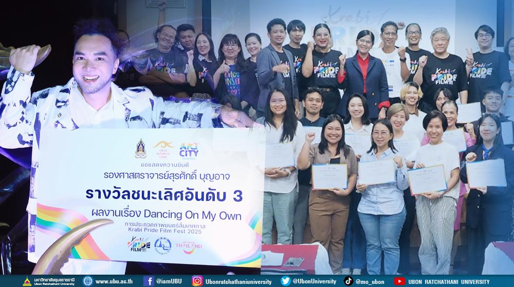 มหาวิทยาลัยอุบลราชธานี โดย รองศาสตราจารย์สุรศักดิ์ บุญอาจ พร้อมด้วยทีมนักศึกษาหลักสูตรนิเทศศาสตร์ คณะศิลปศาสตร์ สร้างชื่อเสียงคว้ารางวัลชนะเลิศ อันดับ 3 การประกวดภาพยนตร์สั้น "Dancing On My Own" ในเทศกาลภาพยนตร์สั้นกระบี่ (Krabi Pride Film Festival 2025) ซึ่งจัดขึ้นอย่างยิ่งใหญ่ โดยได้รับการสนับสนุนหลักจากสำนักงานศิลปวัฒนธรรมร่วมสมัย (OCAC)ณ ลานปูดำ อำเภอเมืองกระบี่ จังหวัดกระบี่ เมื่อวันที่ 21 มิถุนายน 2568 ที่ผ่านมา