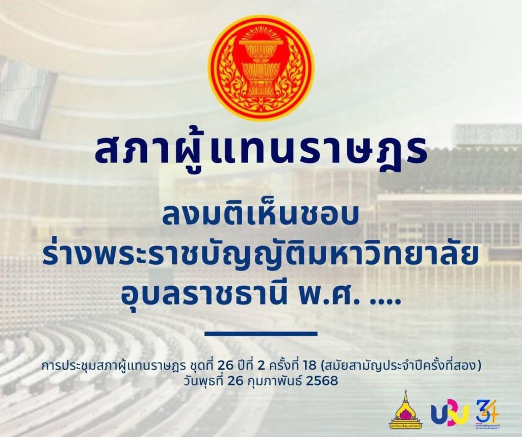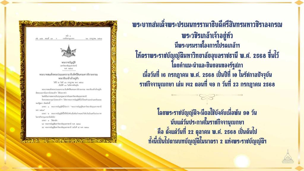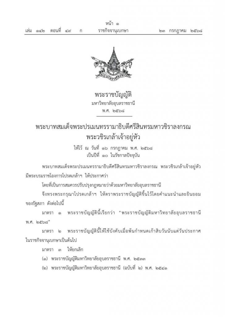 พระบาทสมเด็จพระปรเมนทรรามาธิบดีศรีสินทรมหาวชิราลงกรณ พระวชิรเกล้าเจ้าอยู่หัว มีพระบรมราชโองการโปรดเกล้าฯ ให้ตราพระราชบัญญัติมหาวิทยาลัยอุบลราชธานี พ.ศ. 2568 ขึ้นไว้ โดยคำแนะนำและยินยอมของรัฐสภา เมื่อวันที่ 16 กรกฎาคม พ.ศ. 2568 เป็นปีที่ 10 ในรัชกาลปัจจุบัน ราชกิจจานุเบกษา เล่ม 142 ตอนที่ 49 ก วันที่ 23 กรกฎาคม 2568 โดยพระราชบัญญัติจะมีผลใช้บังคับเมื่อพ้น 90 วัน นับแต่วันประกาศในราชกิจจานุเบกษา คือ ตั้งแต่วันที่ 22 ตุลาคม พ.ศ. 2568 เป็นต้นไป ทั้งนี้เป็นไปตามบทบัญญัติในมาตรา 2 แห่งพระราชบัญญัติฯ
