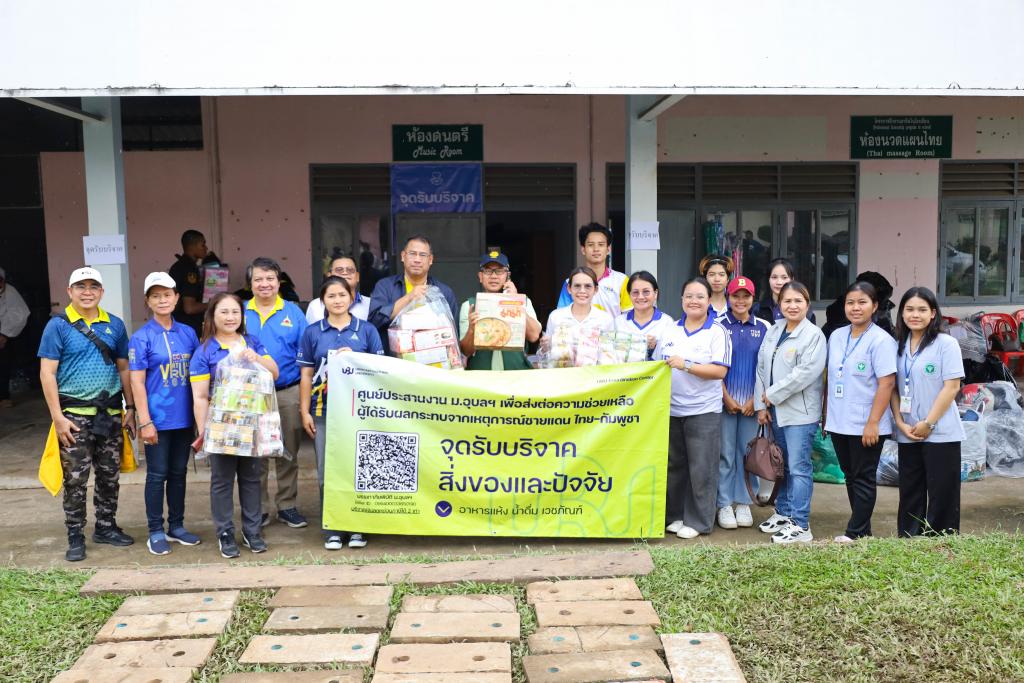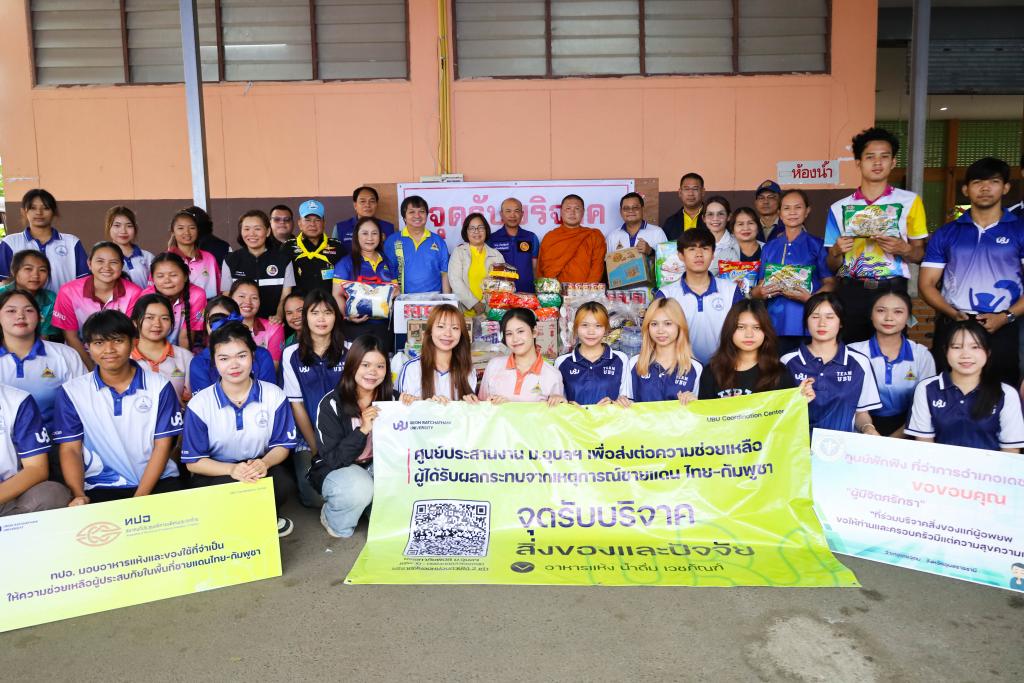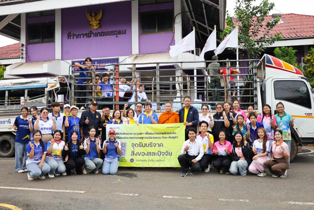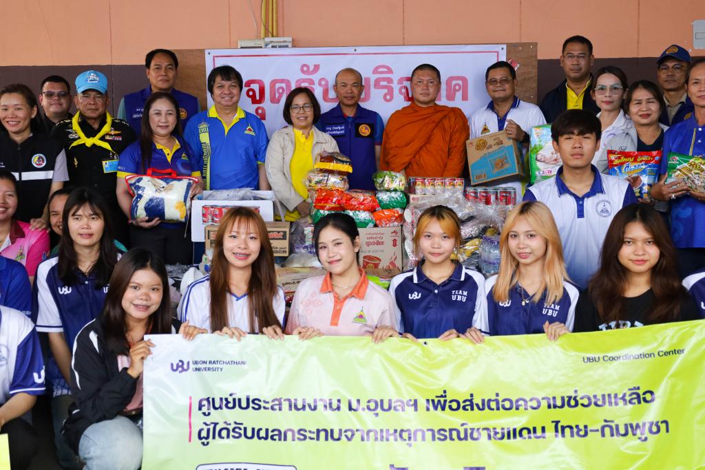 ศูนย์ประสานงาน ม.อุบลฯ เพื่อส่งต่อความช่วยเหลือผู้ได้รับผลกระทบจากเหตุการณ์ชายแดนไทย-กัมพูชา (UBU Coordination Center : UBU COC) โดย ผู้ช่วยศาสตราจารย์ ดร.ปรีชา บุญจูง รองอธิการบดีฝ่ายพัฒนานักศึกษาและศิษย์เก่าสัมพันธ์ พร้อมด้วย ศาสตราจารย์ ดร.ทวนทอง จุฑาเกตุ รองอธิการบดีฝ่ายวิจัยและนวัตกรรม ดร.อนุสรณ์ บรรเทิง ผู้ช่วยอธิการบดีฝ่ายสารสนเทศทางการศึกษาและ ผู้ช่วยศาสตราจารย์เกษร ศาสตราธรรม ผู้ช่วยอธิการบดีฝ่ายวิชาการ นำบุคลากร และนักศึกษา จำนวน 60 คน ลงพื้นที่ส่งมอบสิ่งของบริจาคเครื่องอุปโภค บริโภค เพื่อนำส่งต่อให้กับศูนย์อพยพในพื้นที่ในจุดต่างๆ โดยมี ว่าที่ร้อยตรีกรกฎ ประเสริฐวงษ์ รองผู้ว่าราชการจังหวัดอุบลราชธานี ร่วมรับมอบ ณ ศูนย์รับบริจาคอำเภอเดชอุดม ที่ว่าการอำเภอเดชอุดม จ.อุบลราชธานี