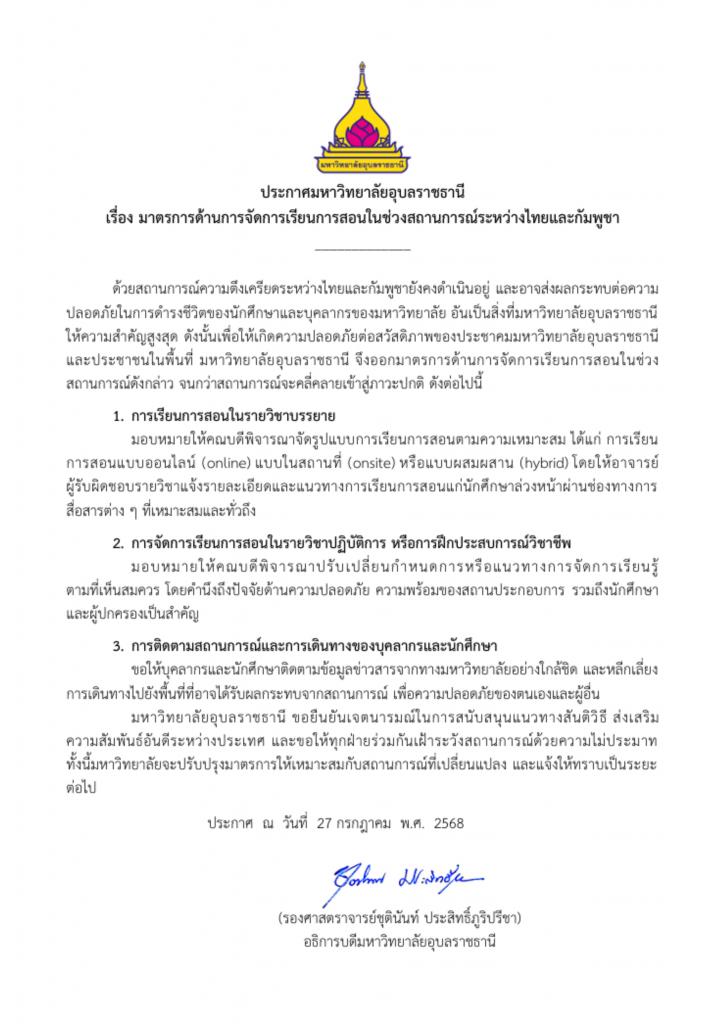 ด้วยสถานการณ์ความตึงเครียดระหว่างไทยและกัมพูชายังคงดำเนินอยู่ และอาจส่งผลกระทบต่อความปลอดภัยในการดำรงชีวิตของนักศึกษาและบุคลากรของมหาวิทยาลัย อันเป็นสิ่งที่มหาวิทยาลัยอุบลราชธานีให้ความสำคัญสูงสุด ดังนั้นเพื่อให้เกิดความปลอดภัยต่อสวัสดิภาพของประชาคมมหาวิทยาลัยอุบลราชธานี และประชาชนในพื้นที่ มหาวิทยาลัยอุบลราชธานี จึงออกมาตรการด้านการจัดการเรียนการสอนในช่วงสถานการณ์ดังกล่าว จนกว่าสถานการณ์จะคลี่คลายเข้าสู่ภาวะปกติ ดังต่อไปนี้