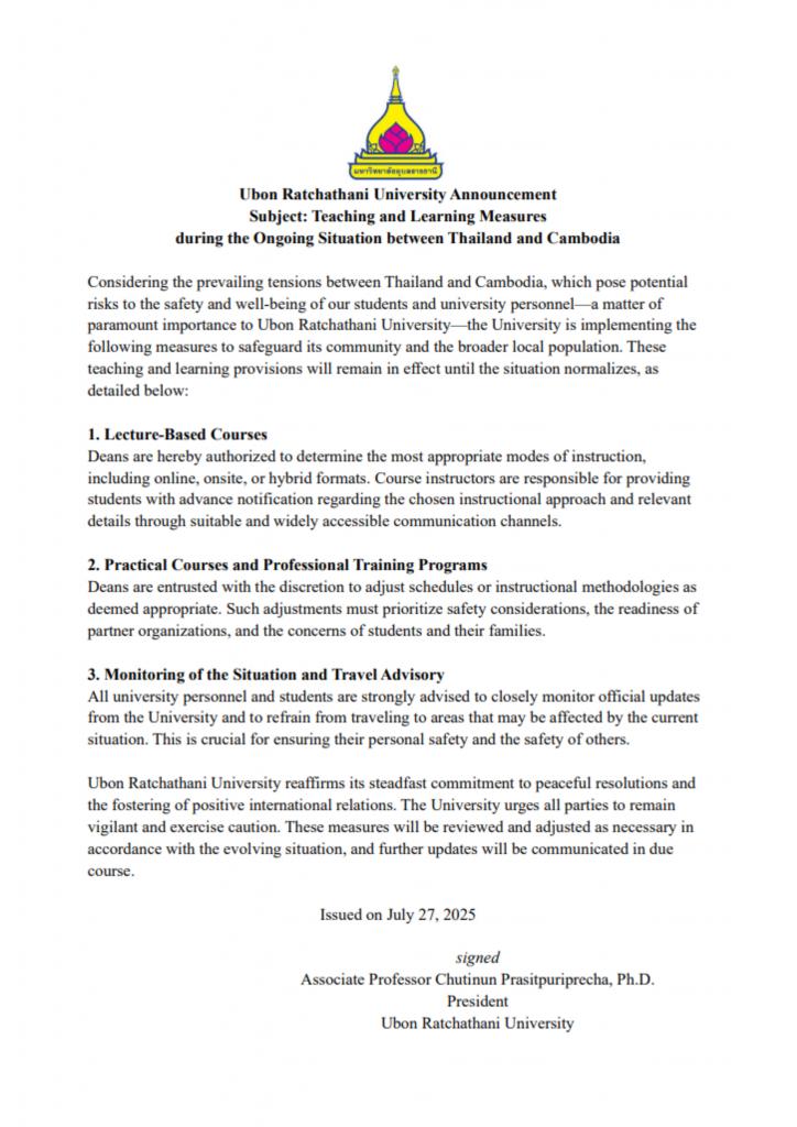 Ubon Ratchathani University reaffirms its steadfast commitment to peaceful resolutions and the fostering of positive international relations. The University urges all parties to remain vigilant and exercise caution. These measures will be reviewed and adjusted as necessary in accordance with the evolving situation, and further updates will be communicated in due course.