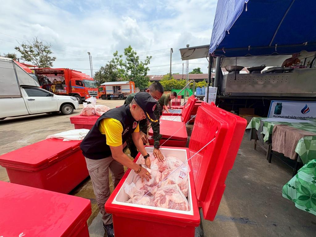 ในส่วนของสิ่งของบริจาคครั้งนี้ ประกอบด้วย วัตถุดิบสำหรับประกอบอาหาร อาทิ เนื้อสัตว์ 600 กิโลกรัมไข่ไก่ 100 ถาด เห็ดเข็มทอง 2,000 กิโลกรัม และรายการอื่นๆ เพื่อสนับสนุนการทำงานของโรงครัวพระราชทานในการจัดเตรียมอาหารให้กับผู้ประสบภัย นอกจากนี้ ยังได้มีการส่งมอบ ยาและเวชภัณฑ์ ที่จำเป็นให้กับศูนย์พักพิงผู้ป่วยเปราะบางในพื้นที่จังหวัดอุบลราชธานี เพื่อดูแลสุขภาพของผู้ที่ได้รับผลกระทบจากสถานการณ์ ดังกล่าว