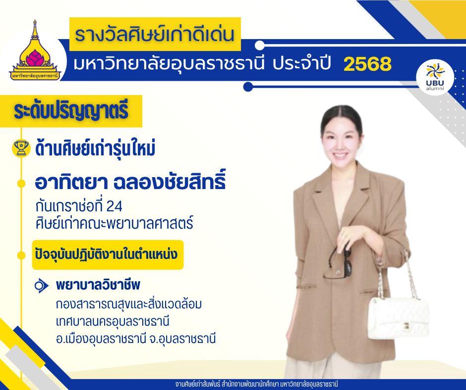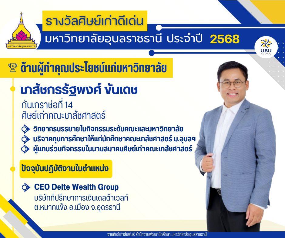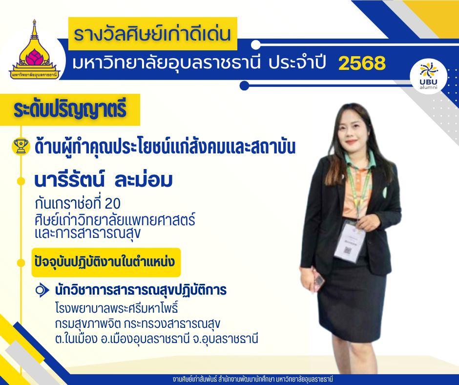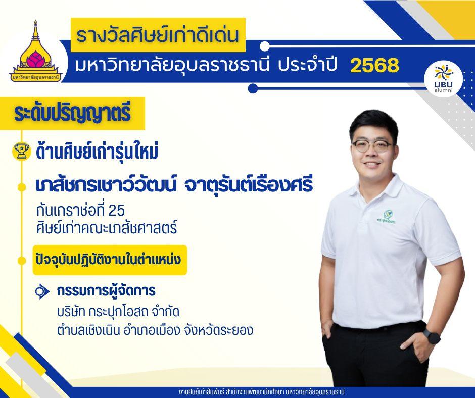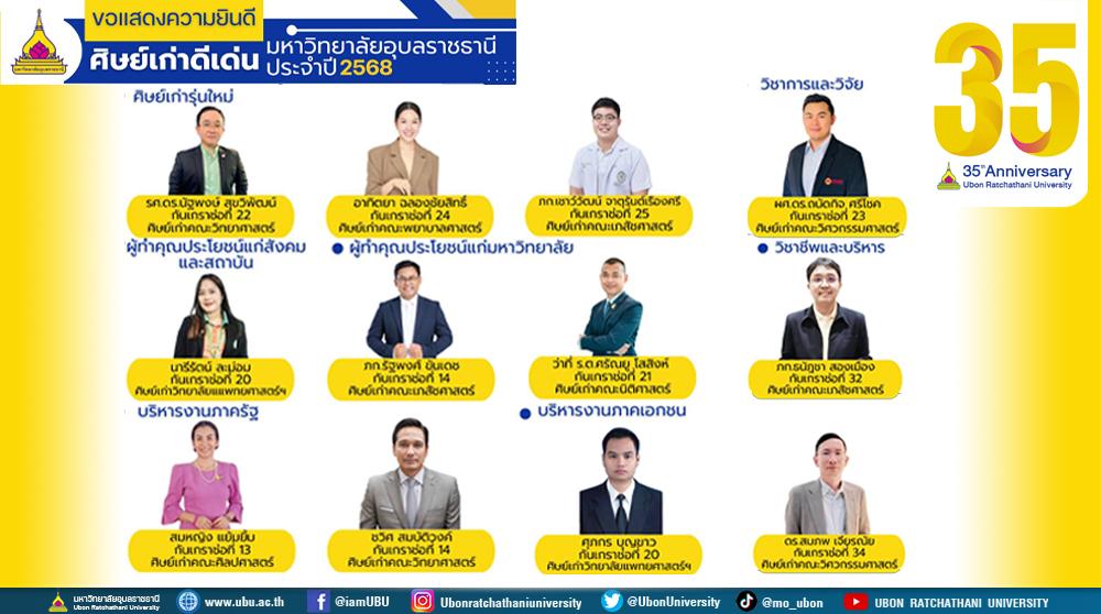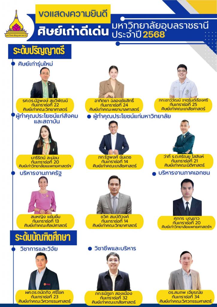 มหาวิทยาลัยอุบลราชธานี ขอแสดงความยินดีกับศิษย์เก่าดีเด่น มหาวิทยาลัยอุบลราชธานี ประจำปี 2568แบ่งตามระดับ และด้านต่างๆ ดังนี้