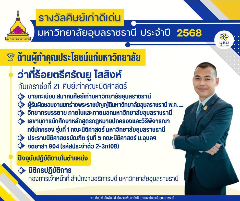 สมาคมศิษย์เก่ามหาวิทยาลัยอุบลราชธานี โดยคณะกรรมการสมาคม และสมาชิกศิษย์เก่า ได้ดำเนินการพิจารณาคัดเลือกศิษย์เก่าดีเด่น มหาวิทยาลัยอุบลราชธานี ประจำปี 2568 ในโอกาสครบรอบ 35 ปี แห่งการสถาปนามหาวิทยาลัย วันที่ 30 กรกฎาคม 2568 เพื่อสร้างขวัญกำลังใจแก่ศิษย์เก่า เป็นส่วนหนึ่งในการสร้างชื่อเสียงให้กับมหาวิทยาลัย ตลอดจนเป็นแรงบันดาลใจในการก้าวสู่ความสำเร็จแก่นักศึกษารุ่นน้องต่อไป