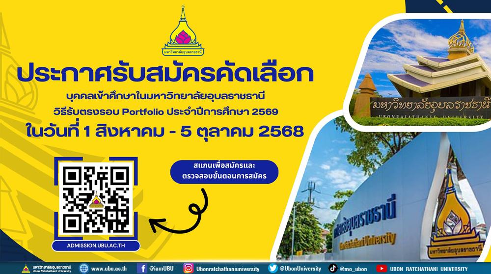 มหาวิทยาลัยอุบลราชธานี เปิดรับสมัครคัดเลือกบุคคลเข้าศึกษาในมหาวิทยาลัยอุบลราชธานี วิธีรับตรงรอบ Portfolio ประจำปีการศึกษา 2569 จำนวน 2,546 คน เปิดรับสมัครระหว่างวันที่ 1 สิงหาคม- 5 ตุลาคม 2568
