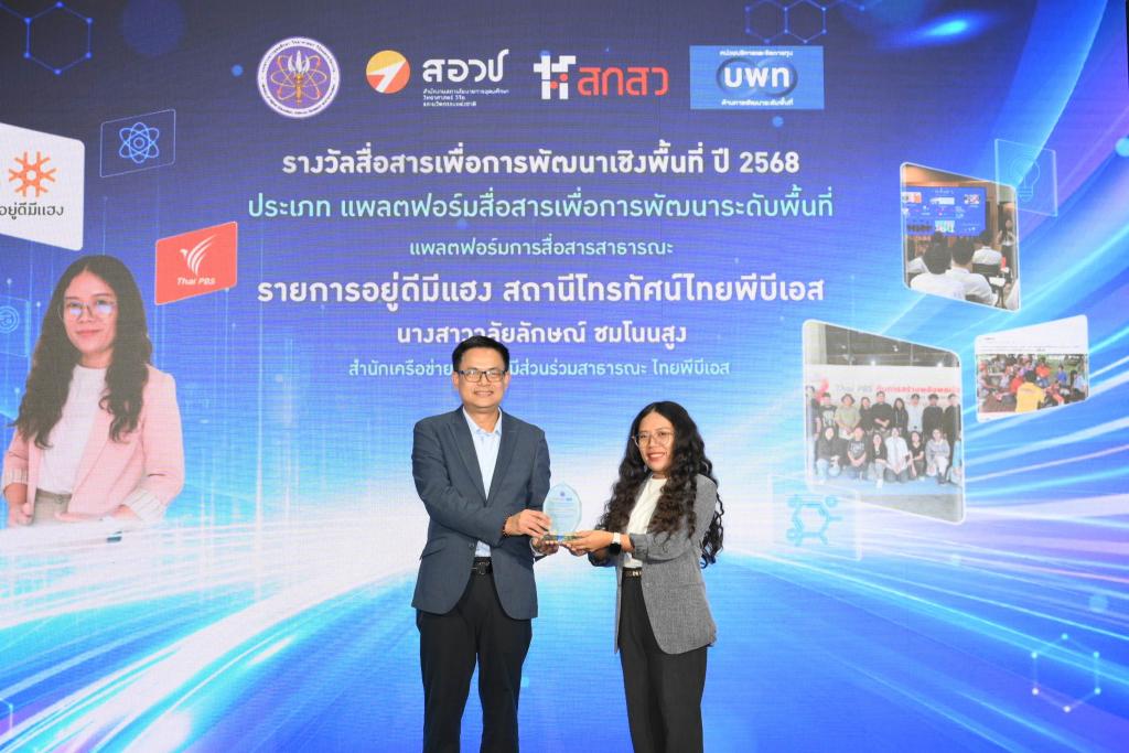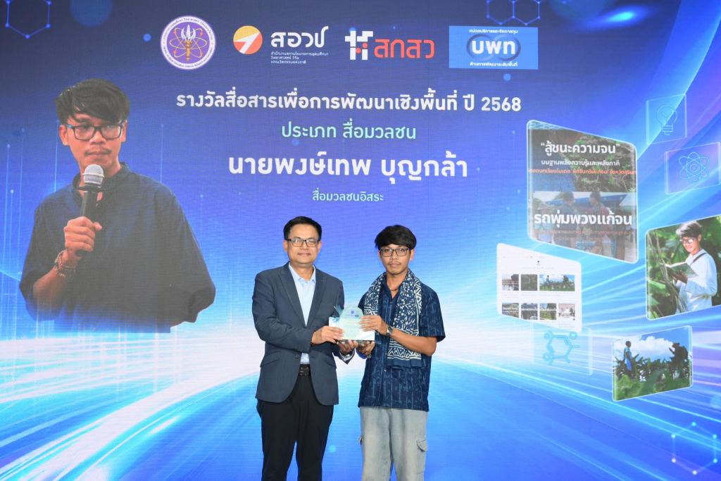 การพิจารณาคัดเลือกรับรางวัลสื่อสารเพื่อการพัฒนาเชิงพื้นที่ ครั้งที่ 2 ประจำปี 2568 จัดขึ้นโดยหน่วยบริหารและจัดการทุนด้านการพัฒนาระดับพื้นที่ (บพท.) สำนักงานสภานโยบายการอุดมศึกษา วิทยาศาสตร์ วิจัยและนวัตกรรมแห่งชาติ (สอวช.) กระทรวงการอุดมศึกษา วิทยาศาสตร์ วิจัยและนวัตกรรม (อว.) ภายใต้โครงการ “การพัฒนาระบบกลไกกระบวนการสื่อสาร สำหรับงานวิจัยและนวัตกรรมเพื่อการพัฒนาระดับพื้นที่เชิงยุทธศาสตร์” ซึ่งมีเป้าหมายเพื่อยกระดับกลไกและกระบวนการด้านการสื่อสารให้มีบทบาทสนับสนุนการวิจัยเพื่อพัฒนาเชิงพื้นที่อย่างมีประสิทธิภาพ รวมถึงส่งเสริมให้เกิดความตระหนักรู้ในคุณค่าการใช้ประโยชน์งานวิจัยและนวัตกรรมเพื่อการพัฒนาพื้นที่ให้มีความต่อเนื่องและยั่งยืน โดย นางสาววลัยลักษณ์ ชมโนนสูง และ รายการอยู่ดีมีแฮง ได้รับรางวัลประเภทแพลตฟอร์มสื่อสารเพื่อการพัฒนาระดับพื้นที่ แพลตฟอร์มการสื่อสารสาธารณะ และ นายพงษ์เทพ บุญกล้า ได้รับ รางวัลสื่อสารเพื่อการพัฒนาเชิงพื้นที่ ปี 2568 ประเภทสื่อมวลชนอิสระ