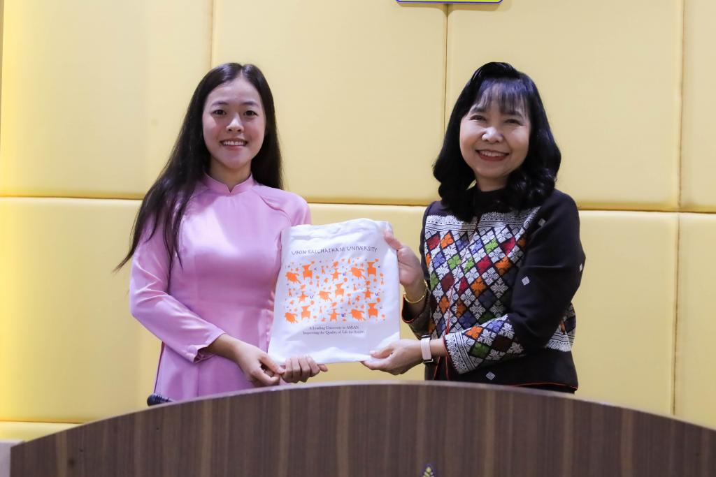 มหาวิทยาลัยอุบลราชธานี โดย สำนักงานวิเทศสัมพันธ์และการศึกษานานาชาติ จัดกิจกรรมต้อนรับนักศึกษาแลกเปลี่ยน จาก University of Foreign Languages and International Studies, Hue University (HUFLIS) สาธารณรัฐสังคมนิยมเวียดนาม ภายใต้โครงการฝึกประสบการณ์วิชาชีพด้านการใช้ภาษาอังกฤษในการสอน ตามความร่วมมือทางวิชาการร่วมกับ คณะศิลปศาสตร์ โดยมี รองศาสตราจารย์ ดร.ชุตินันท์ ประสิทธิ์ภูริปรีชา อธิการบดี เป็นประธานกล่าวต้อนรับสู่มหาวิทยาลัยอุบลราชธานี ซึ่งมี ผู้ช่วยศาสตราจารย์ ดร.อรนุช ปวงสุข ผู้ช่วยอธิการบดีฝ่ายวิเทศสัมพันธ์และการศึกษานานาชาติ พร้อมด้วย ผู้ช่วยศาสตราจารย์ ดร.เฉลิมชัย วงศ์รักษ์ รองคณบดีฝ่ายวิชาการและวิเทศสัมพันธ์ คณะศิลปศาสตร์ ร่วมให้การต้อนรับอย่างอบอุ่น ณ ห้องประชุมวารินชำราบ ชั้น 3 อาคารสำนักงานอธิการบดี 2