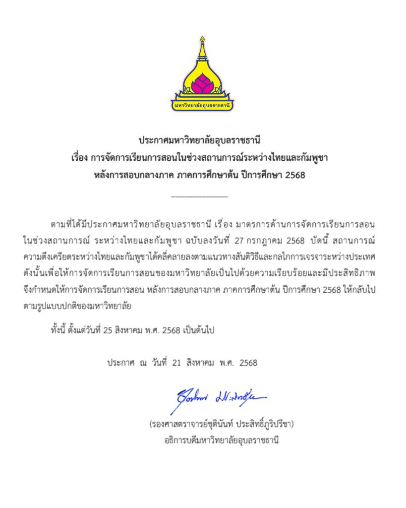 ตามที่ได้มีประกาศมหาวิทยาลัยอุบลราชธานี เรื่อง มาตรการด้านการจัดการเรียนการสอน ในช่วงสถานการณ์ ระหว่างไทยและกัมพูชา ฉบับลงวันที่ 27 กรกฎาคม 2568