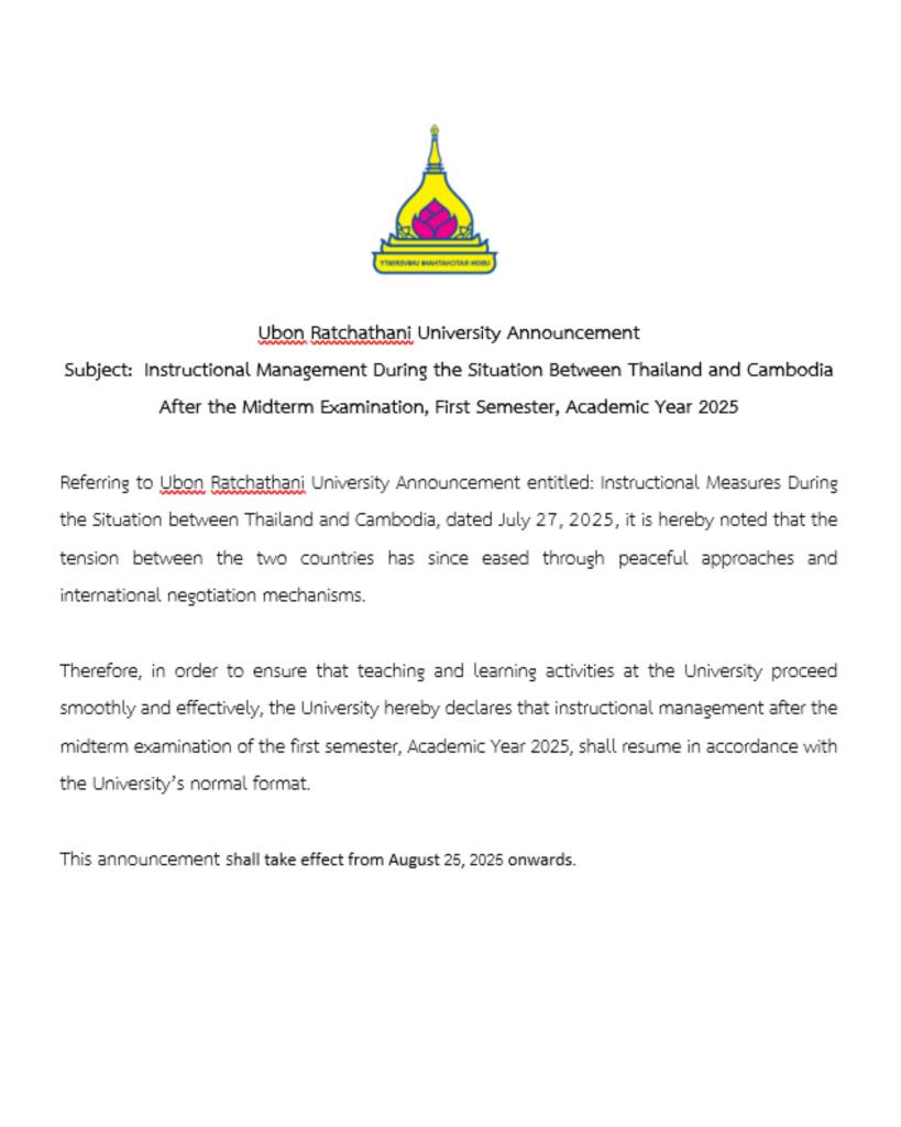 Referring to Ubon Ratchathani University Announcement entitled: Instructional Measures During the Situation between Thailand and Cambodia, dated July 27, 2025, it is hereby noted that the tension between the two countries has since eased through peaceful approaches and international negotiation mechanisms.