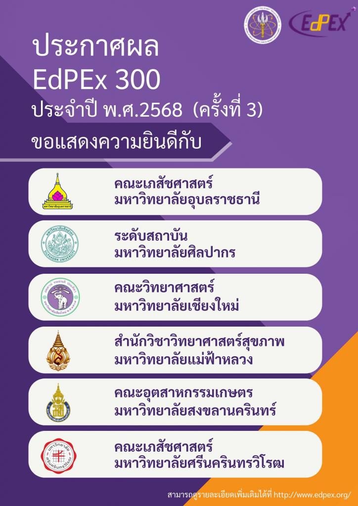 ตามที่ สำนักงานปลัดกระทรวงการอุดมศึกษา วิทยาศาสตร์ วิจัยและนวัตกรรม (สป.อว.) ได้กำหนดให้หน่วยงาน EdPEx200 ดำเนินการพัฒนาและยกระดับการจัดการศึกษา เพื่อให้พร้อมรับการตรวจประเมินคุณภาพระดับ 300 คะแนน ภายใน 4 ปี นั้น ในการนี้ สป.อว. ขอเรียนว่าคณะอนุกรรมการดำเนินงานโครงการพัฒนาคุณภาพการศึกษาสู่ความเป็นเลิศด้วยเกณฑ์คุณภาพการศึกษาเพื่อการดำเนินการที่เป็นเลิศ (Education Criteria for Performance Excellence : EdPEx) ในการประชุมครั้งที่ 6/2568 เมื่อวันที่ 25 สิงหาคม 2568 มีมติเห็นชอบให้ประกาศรายชื่อหน่วยงานที่ผ่านการตรวจประเมินคุณภาพระดับ 300 คะแนน (EdPEx300) จำนวน 6 หน่วยงาน ดังต่อไปนี้
