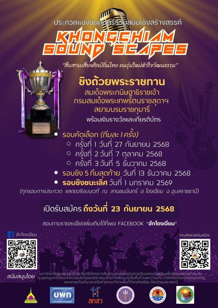 สนใจสมัครเข้าร่วมการประกวดแข่งขันดนตรีร่วมสมัยเชิงสร้างสรรค์ ชิงถ้วยพระราชทาน สมเด็จพระกนิษฐาธิราชเจ้า กรมสมเด็จพระเทพรัตนราชสุดาฯ สยามบรมราชกุมารี (ประเภทบุคคลทั่วไป ไม่จำกัดเพศและอายุ) และติดต่อสอบถามรายละเอียดได้ที่... คุณจุฑามณี เจริญสกุลทรัพย์ (ฝ้าย) โทร. 085-0156835 ดูรายละเอียดเพิ่มเติมได้ที่เพจ “ฮักโขงเจียม-Hug Khong Chiam” https://www.facebook.com/hugkhongchiam และสมัครทาง Google Form: https://forms.gle/phRExgD2qz4qiBoD6 ตั้งแต่วันนี้เป็นต้นไป จนถึงวันที่ 23 กันยายน 2568