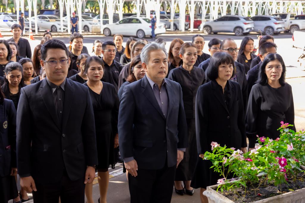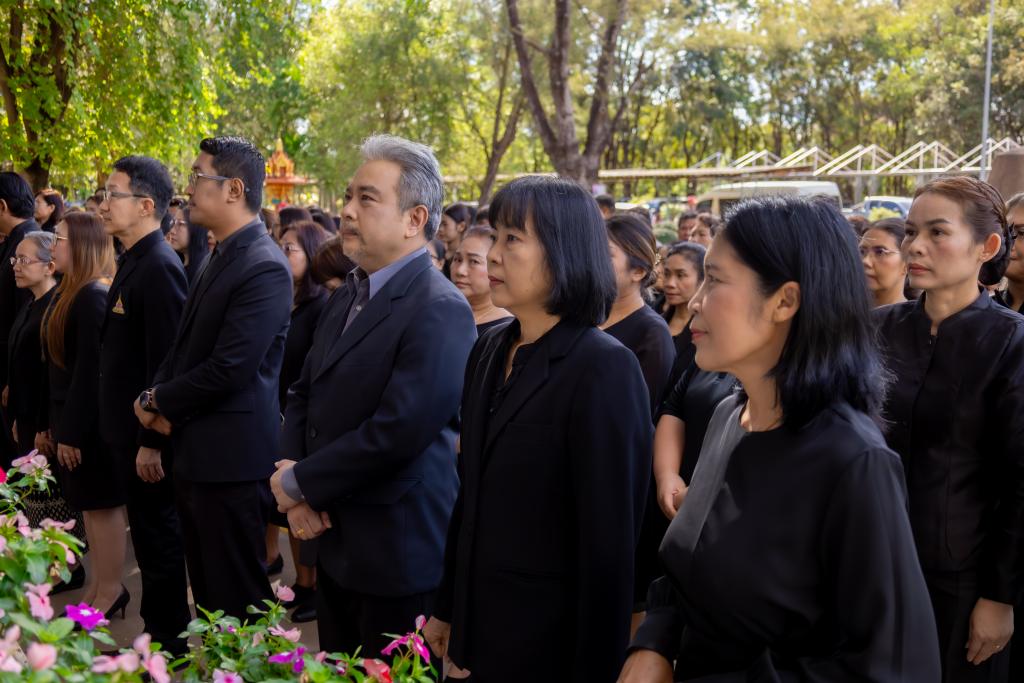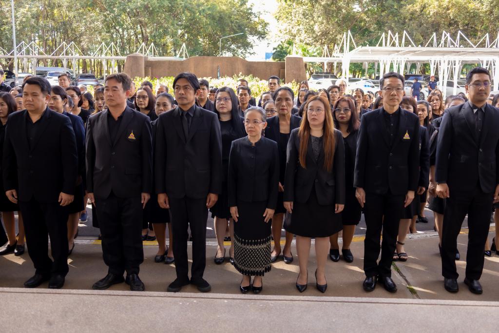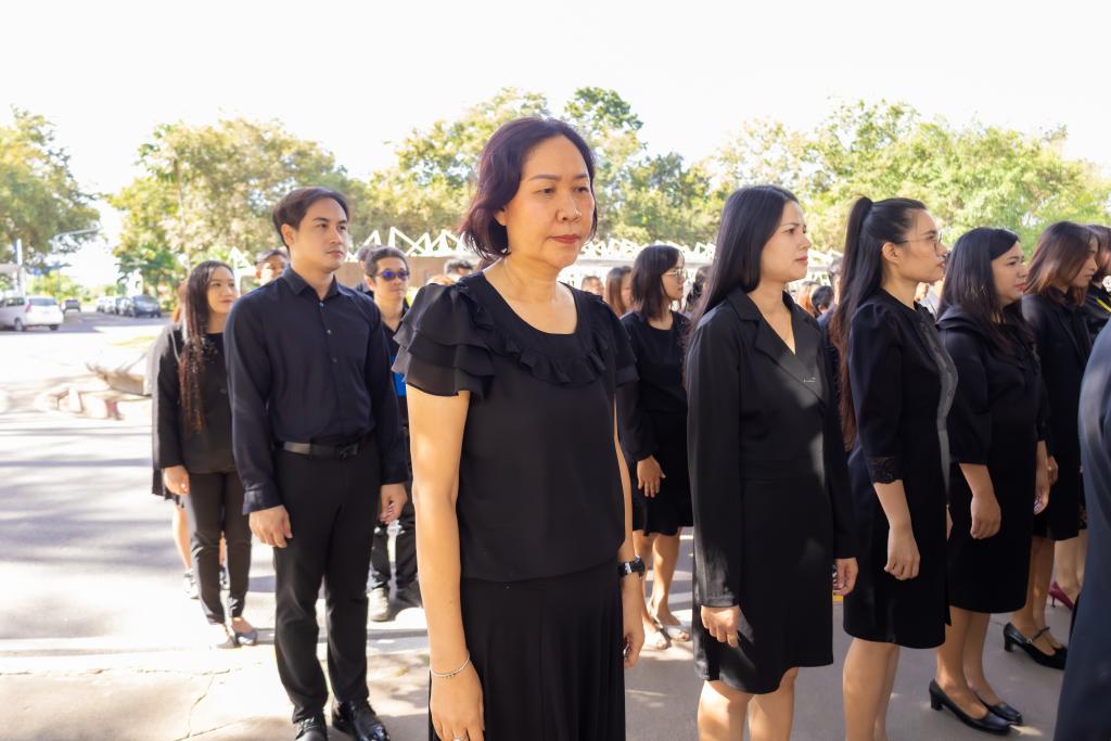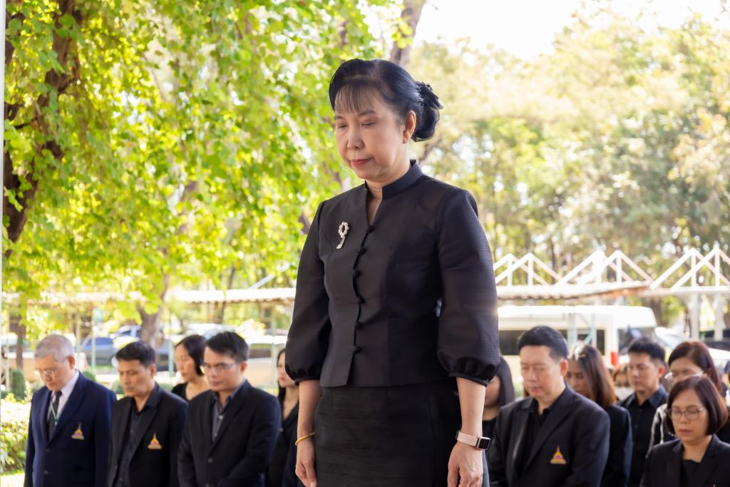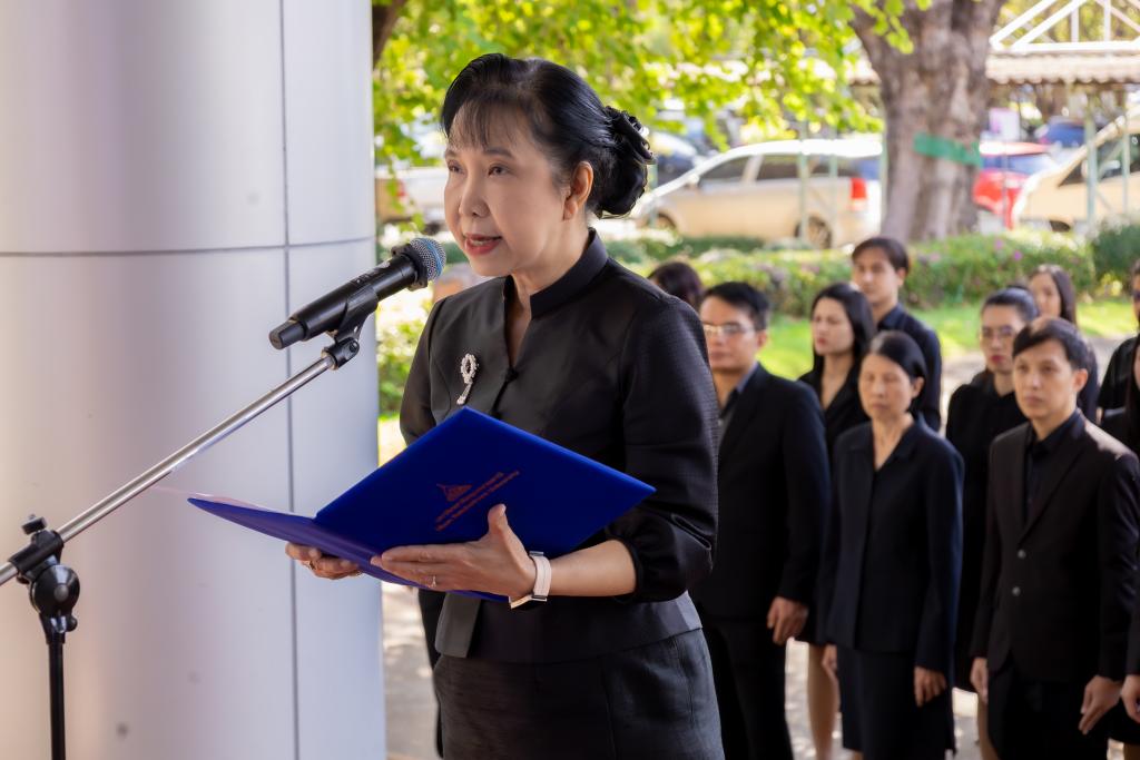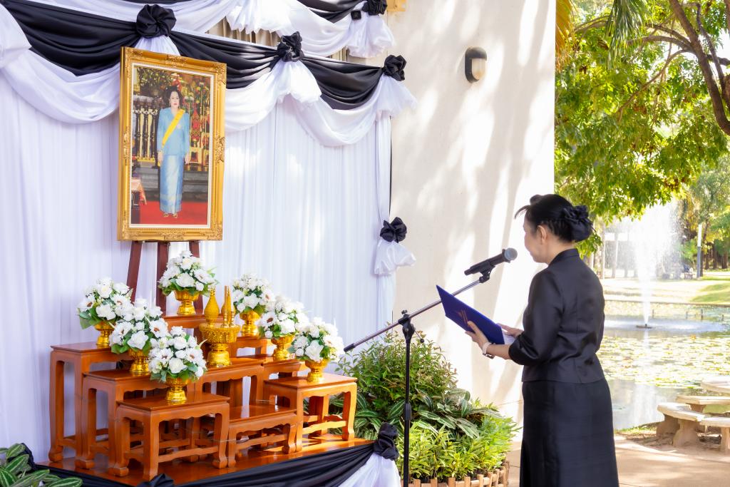 รองศาสตราจารย์ ดร.ชุตินันท์ ประสิทธิภูริปรีชา อธิการบดี กล่าวถวายความอาลัย น้อมรำลึกถึงพระมหากรุณาธิคุณ ของ สมเด็จพระนางเจ้าสิริกิติ์ พระบรมราชินีนาถ พระบรมราชชนนีพันปีหลวง ที่พระองค์ทรงปฏิบัติพระราชกรณียกิจนานัปการเพื่อประโยชน์สุขของประชาชนและความเจริญมั่นคงของประเทศชาติ พระองค์ท่านเป็นดั่งแม่แห่งแผ่นดิน ผู้ทรงเปี่ยมด้วยพระเมตตาและพระปรีชาสามารถ ทรงอุทิศพระวรกาย พระสติปัญญา และพระราชหฤทัยในการบำเพ็ญพระราชกรณียกิจนานัปการ เคียงคู่พระบาทสมเด็จพระบรมชนกาธิเบศร มหาภูมิพลอดุลยเดชมหาราช บรมนาถบพิตร เพื่อธำรงไว้ซึ่งความผาสุกและความมั่นคงแห่งชาติไทย