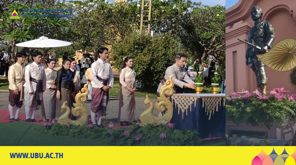ผู้ช่วยศาสตราจารย์ ดร.เกรียงศักดิ์ แก้วกุลชัย รองอธิการบดีฝ่ายบริหาร นางสาวมัณฑนา เจือบุญ ผู้อำนวยการกองกลาง สำนักงานอธิการบดี นำบุคลากรและนักศึกษา มหาวิทยาลัยอุบลราชธานีร่วมพิธีบวงสรวงและสดุดีวีรกรรมพระประทุมวรราชสุริยวงษ์ (เจ้าคำผง) ประจำปี 2568 และร่วมขบวนอัญเชิญเครื่องยศเจ้าเมืองและขันหมากเบ็ง โดยมี นายชำนาญ ชื่นตา ผู้ว่าราชการจังหวัดอุบลราชธานี เป็นประธานนำนำหัวหน้าส่วนราชการ หัวหน้าหน่วยงานภาครัฐและเอกชน รัฐวิสาหกิจ องค์กรปกครองส่วนท้องถิ่น มูลนิธิเจ้าคำผง ภาคเอกชน คหบดี และประชาชนชาวจังหวัดอุบลราชธานี ร่วมประกอบพิธีและขบวนอัญเชิญเครื่องยศเจ้าเมืองและขันหมากเบ็ง เพื่อร่วมสดุดีรำลึกและเผยแพร่เกียรติคุณพระประทุมวรราชสุริยวงษ์ (เจ้าคำผง) ผู้สร้างบ้านแปงเมืองอุบลราชธานี เมื่อวันจันทร์ที่ 10 พฤศจิกายน 2568 ณ วัดหลวง และอนุสาวรีย์พระปทุมวรราชสุริยวงษ์ (เจ้าคำผง) บริเวณทุ่งศรีเมือง จังหวัดอุบลราชธานี