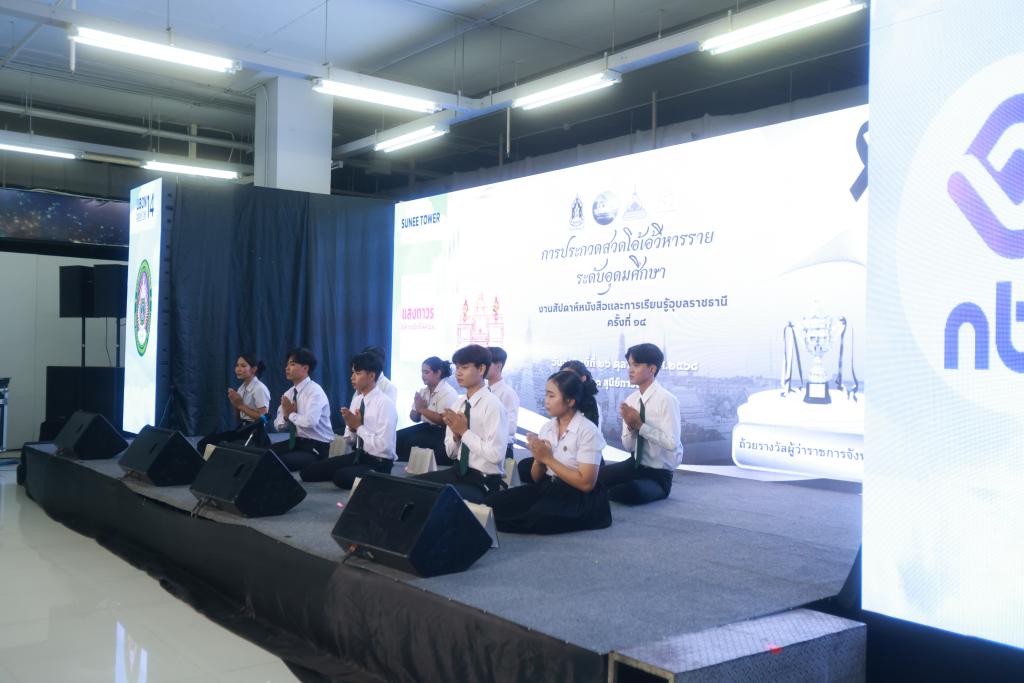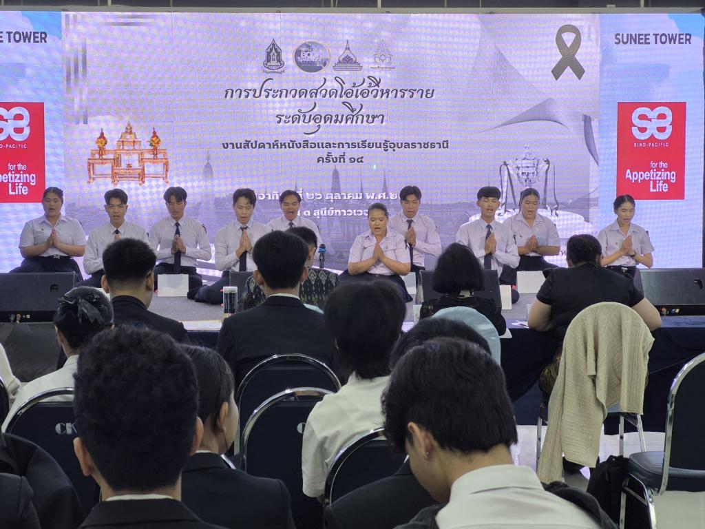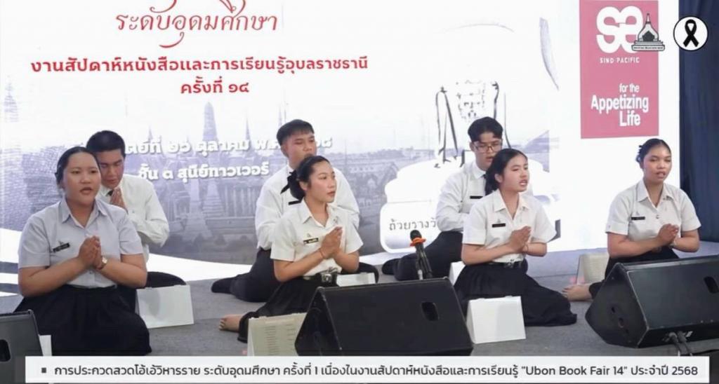 คณะศึกษาศาสตร์ มหาวิทยาลัยอุบลราชธานี โดย วิชาเอกภาษาไทย ร่วมกับ ภาคีเครือข่ายภาครัฐและเอกชน จัดกิจกรรม “การประกวดสวดโอ้เอ้วิหารราย โบราณราชประเพณี ระดับอุดมศึกษา” ชิงถ้วยรางวัล ผู้ว่าราชการจังหวัดอุบลราชธานี ในงานสัปดาห์หนังสือและการเรียนรู้อุบลราชธานี ครั้งที่ 14 (Ubon Book Fair 14) เพื่อสืบสานมรดกทางวัฒนธรรมด้านภาษาและวรรณศิลป์ไทย โดยมี ร้อยตรีสรมงคล มงคละสิริ รองผู้ว่าราชการจังหวัดอุบลราชธานี เป็นประธาน มอบรางวัล โอกาสนี้ ผู้ช่วยศาสตราจารย์ ดร.ปิยณัฐ สร้อยคำ ผู้ช่วยอธิการบดีฝ่ายการตลาด ร่วมเป็นเกียรติในงานนี้ด้วย ซึ่งได้รับความสนใจผู้เข้าร่วมงานจำนวนมาก ณ เวทีกิจกรรม ศูนย์การค้าสุนีย์ทาวเวอร์ จังหวัดอุบลราชธานี เมื่อวันที่ 26 ตุลาคม 2568 ที่ผ่านมา