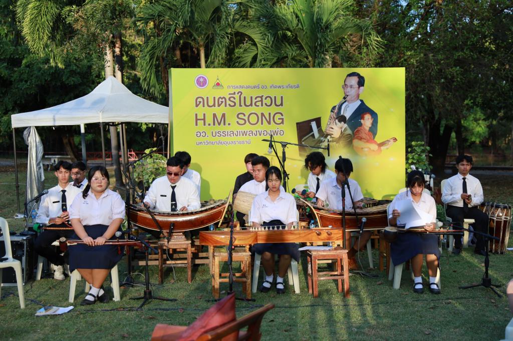 โดย มหาวิทยาลัยอุบลราชธานี ได้จัดกิจกรรม ดนตรีในสวน H.M.Song อว. บรรเลงเพลงของพ่อ เพื่อน้อมรำลึกถึงพระมหากรุณาธิคุณ ในโอกาส วันคล้ายวันพระบรมราชสมภพ 5 ธันวาคม พระบาทสมเด็จพระบรมชนกาธิเบศร มหาภูมิพลอดุลยเดชมหาราช บรมนาถบพิตร ผู้ทรงเป็นที่รักและเทิดทูนยิ่งของปวงชนชาวไทย พระองค์ทรงมีพระปรีชาสามารถอันโดดเด่นในหลายด้าน โดยเฉพาะพระอัจฉริยภาพทางดนตรีที่ทรงสร้างบทเพลงพระราชนิพนธ์อันทรงคุณค่า ทั้งนี้ เพื่อเทิดพระเกียรติและเผยแพร่พระอัจฉริยภาพด้านดนตรีของพระองค์ผ่านบทเพลงพระราชนิพนธ์ ส่งเสริมความรักและความสามัคคีในหมู่ประชาชน โดยใช้ดนตรีเป็นสื่อกลางในการสร้างความสัมพันธ์อันดี และเสริมสร้างบทบาทของมหาวิทยาลัยอุบลราชธานีในฐานะศูนย์กลางด้านการอนุรักษ์และเผยแพร่วัฒนธรรม โดยร่วมกันถ่ายทอดบทเพลงพระราชนิพนธ์ที่มีความไพเราะงดงามแล้ว ยังสะท้อนถึงพระราชวิสัยทัศน์และความรักอันยิ่งใหญ่ที่ทรงมีต่อประชาชน อันหาที่สุดมิได้