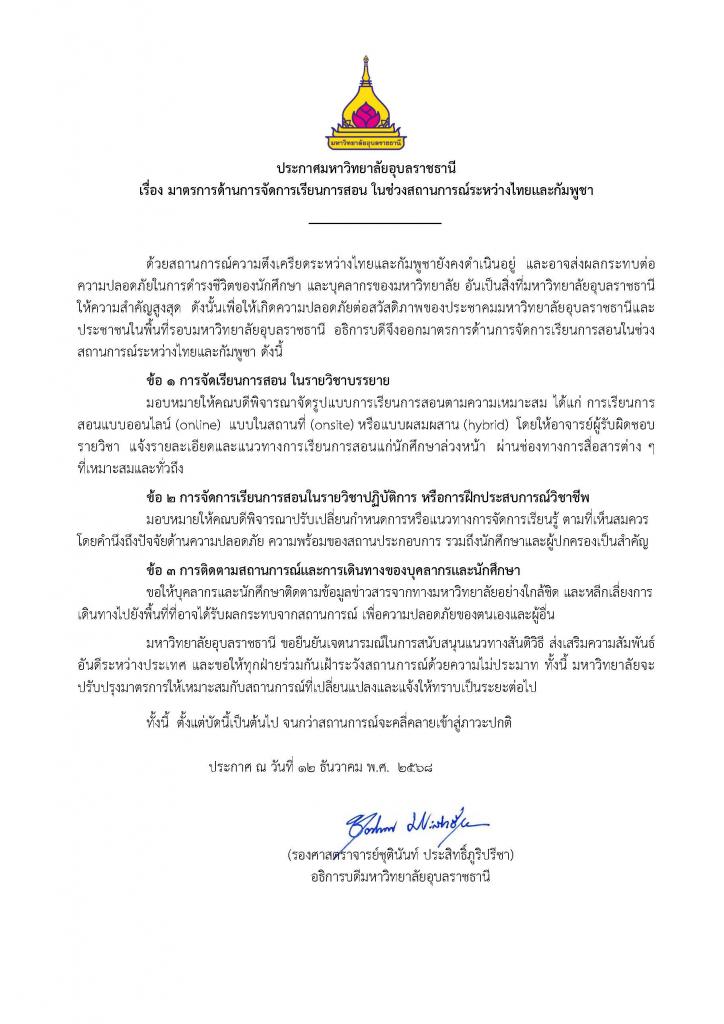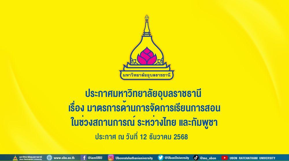 ด้วยสถานการณ์ความตึงเครียดระหว่างไทยและกัมพูชา ยังคงดำเนินอยู่และอาจส่งผลกระทบต่อความปลอดภัย ในการดำรงชีวิตของนักศึกษา และบุคลากรของมหาวิทยาลัย อันเป็นสิ่งที่มหาวิทยาลัยอุบลราชธานี ให้ความสำคัญสูงสุด ดังนั้น เพื่อให้เกิดความปลอดภัยต่อสวัสดิภาพของประชาคม มหาวิทยาลัยอุบลราชธานี และประชาชนในพื้นที่ มหาวิทยาลัยอุบลราชธานี จึงออกมาตรการด้านการจัดการเรียนการสอนในช่วงสถานการณ์ดังกล่าว จนกว่าสถานการณ์จะคลี่คลายเข้าสู่ภาวะปกติ ดังนี้