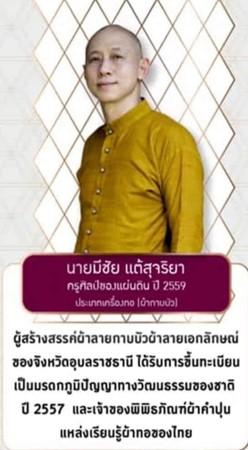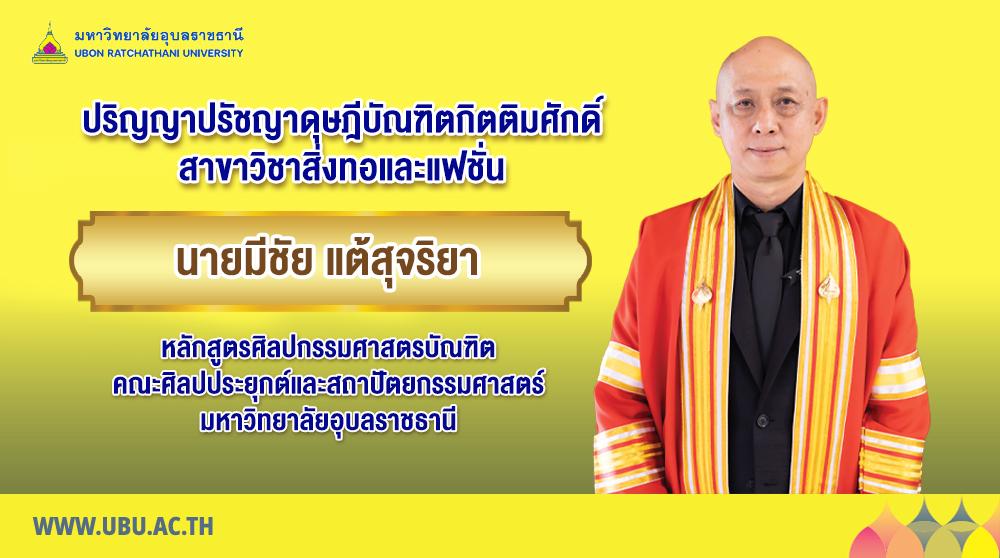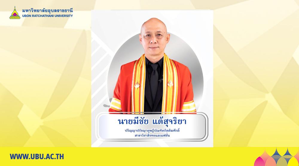 มหาวิทยาลัยอุบลราชธานี มีความยินดีประกาศเกียรติคุณเพื่อเชิดชูเกียรติ นายมีชัย แต้สุจริยา ที่ได้รับปริญญาปรัชญาดุษฎีบัณฑิตกิตติมศักดิ์ หลักสูตรศิลปกรรมศาสตร์บัณฑิต สาขาออกแบบสิ่งทอและแฟชั่น คณะศิลปประยุกต์และสถาปัตยกรรมศาสตร์ มหาวิทยาลัยอุบลราชธานี โดย สภามหาวิทยาลัยอุบลราชธานี ได้พิจารณาอนุมัติปริญญากิตติมศักดิ์ ประจำปีการศึกษา ๒๕๖๗ แก่บุคคลผู้มีผลงานทางวิชาการดีเด่นในสาขาที่มีการสอนในมหาวิทยาลัย ทำคุณประโยชน์อย่างยิ่งแก่มหาวิทยาลัยหรือประเทศชาติหรือนานาชาติ สมควรได้รับการยกย่องเป็นแบบอย่างให้ผู้อื่นเจริญรอยตาม ผลงานสามารถนำไปใช้ประโยชน์อย่างกว้างขวางอันส่งผลดีต่อการพัฒนาองค์ความรู้ขององค์กร สังคม ประเทศชาติหรือนานาชาติ โดยจะเข้ารับพระราชทานปริญญากิตติมศักดิ์ ประจำปีการศึกษา ๒๕๖๗ ในวันพุธที่ ๒๔ ธันวาคม พ.ศ. ๒๕๖๘ ณ อาคารเฉลิมพระเกียรติ ๗ รอบ พระชนมพรรษา มหาวิทยาลัยอุบลราชธานี