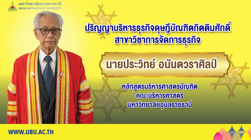 มหาวิทยาลัยอุบลราชธานี มีความยินดีประกาศเกียรติคุณเพื่อเชิดชูเกียรติ นายประวิทย์ อนันตวราศิลป์ ที่ได้รับปริญญาบริหารธุรกิจดุษฎีบัณฑิตกิตติมศักดิ์ สาขาวิชาการจัดการธุรกิจ มหาวิทยาลัยอุบลราชธานี โดย สภามหาวิทยาลัยอุบลราชธานี ได้พิจารณาอนุมัติปริญญากิตติมศักดิ์ ประจำปีการศึกษา ๒๕๖๗ แก่บุคคลผู้มีผลงานทางวิชาการดีเด่นในสาขาที่มีการสอนในมหาวิทยาลัย ทำคุณประโยชน์อย่างยิ่งแก่มหาวิทยาลัยหรือประเทศชาติหรือนานาชาติ สมควรได้รับการยกย่องเป็นแบบอย่างให้ผู้อื่นเจริญรอยตาม ผลงานสามารถนำไปใช้ประโยชน์อย่างกว้างขวางอันส่งผลดีต่อการพัฒนาองค์ความรู้ขององค์กร สังคม ประเทศชาติหรือนานาชาติ โดยจะเข้ารับพระราชทานปริญญากิตติมศักดิ์ ประจำปีการศึกษา ๒๕๖๗ ในวันพุธที่ ๒๔ ธันวาคม พ.ศ. ๒๕๖๘ ณ อาคารเฉลิมพระเกียรติ ๗ รอบ พระชนมพรรษา มหาวิทยาลัยอุบลราชธานี