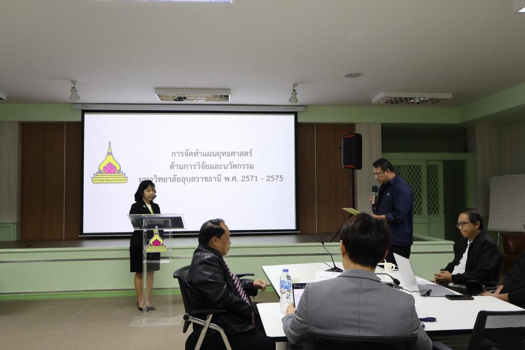 รับเกียรติจาก รองศาสตราจารย์ชุตินันท์ ประสิทธิ์ภูริปรีชา อธิการบดี เป็นประธานกล่าวเปิดการประชุม พร้อมด้วย ศาสตราจารย์ทวนทอง จุฑาเกตุ รองอธิการบดีฝ่ายวิจัยและนวัตกรรม กล่าวรายงานวัตถุประสงค์ และนำเสนอ (ร่าง) แผนยุทธศาสตร์ด้านการวิจัยและนวัตกรรม มหาวิทยาลัยอุบลราชธานี พ.ศ. 2571–2575เพื่อใช้เป็นกรอบในการแลกเปลี่ยนความคิดเห็นร่วมกัน