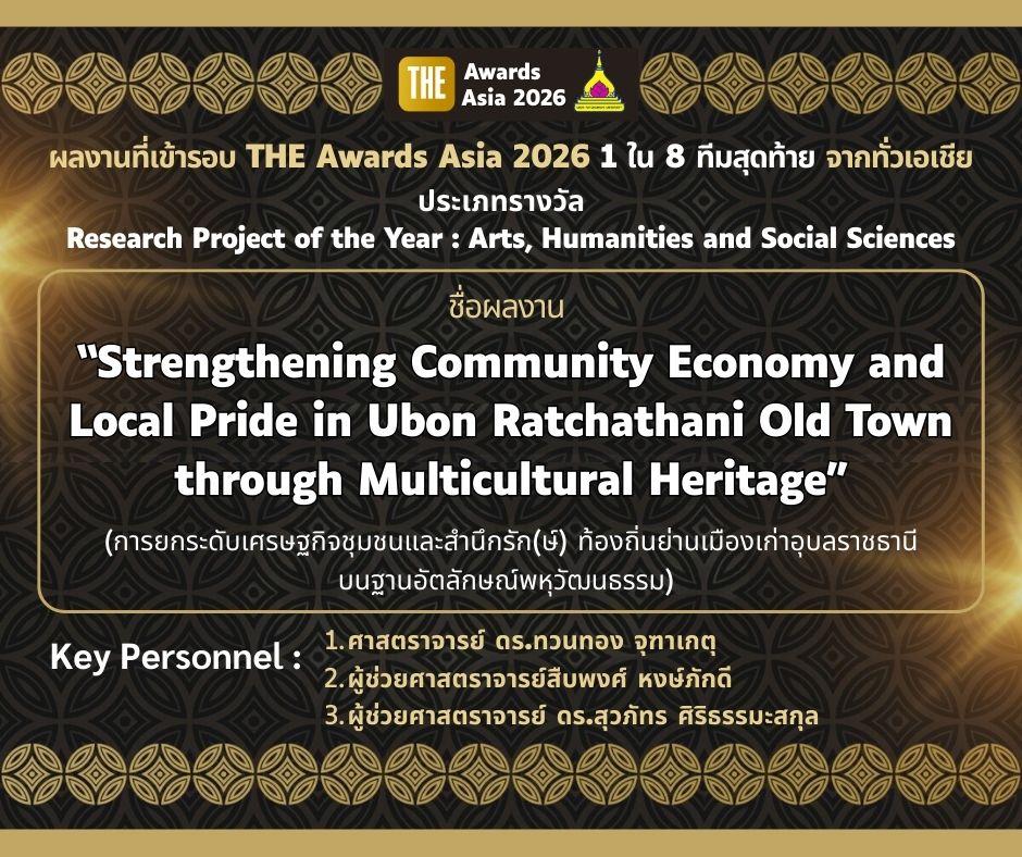 มหาวิทยาลัยอุบลราชธานีได้รับการคัดเลือกผลงานเข้าสู่ รอบสุดท้าย (Shortlisted) การประกวด THE Awards Asia 2026 ซึ่งเป็นรางวัลระดับเอเชียที่จัดโดย Times Higher Education เพื่อยกย่องผลงานและการดำเนินงานของมหาวิทยาลัยที่สร้างคุณค่าและผลกระทบเชิงบวกต่อสังคมอย่างเป็นรูปธรรมโดยผลงานที่ผ่านเข้าสู่รอบสุดท้ายได้แก่