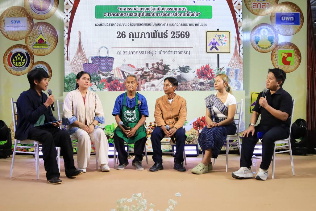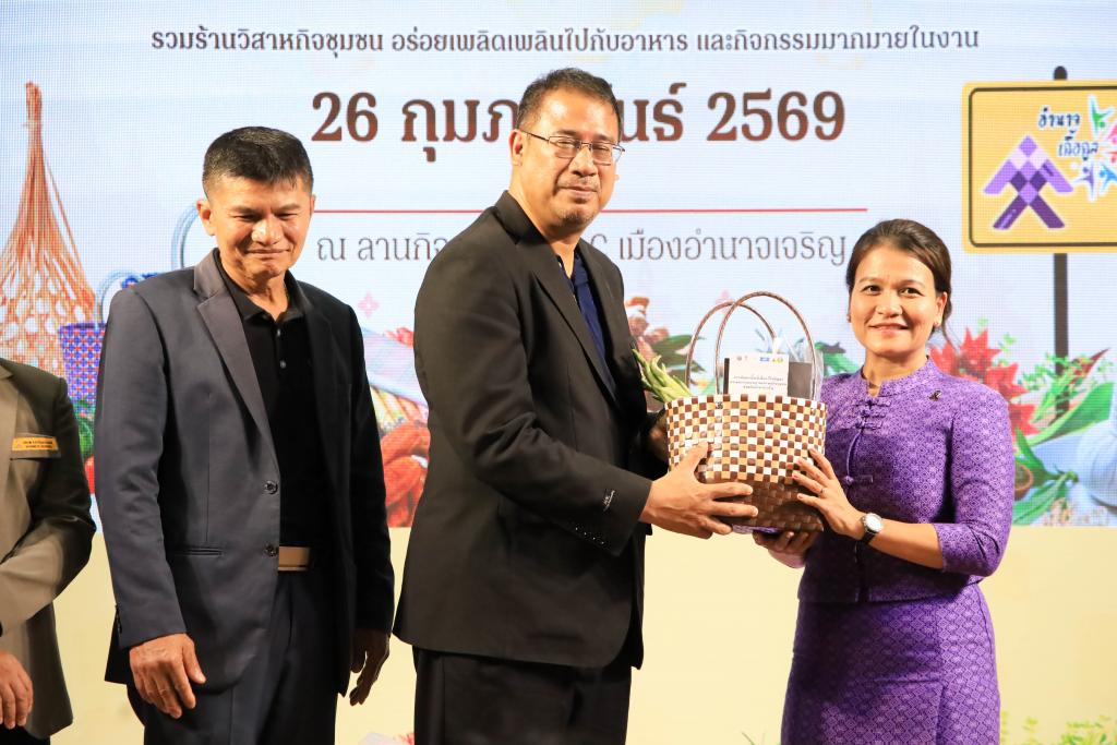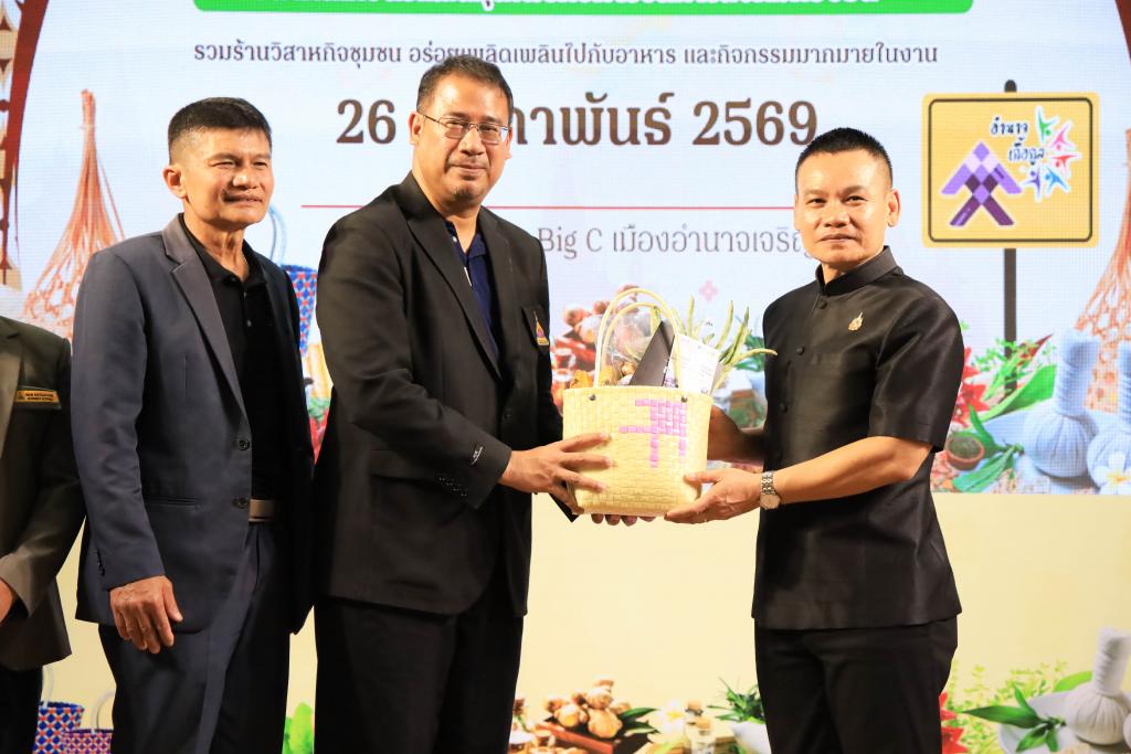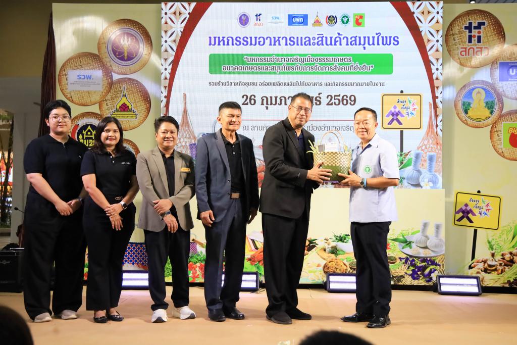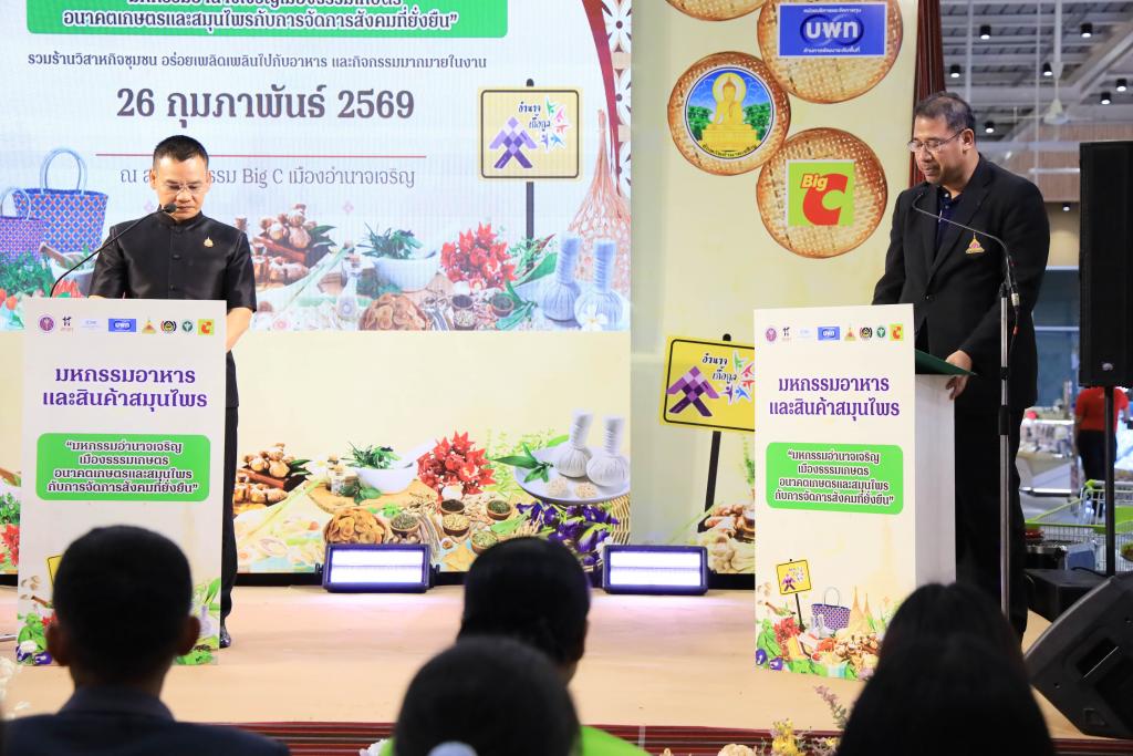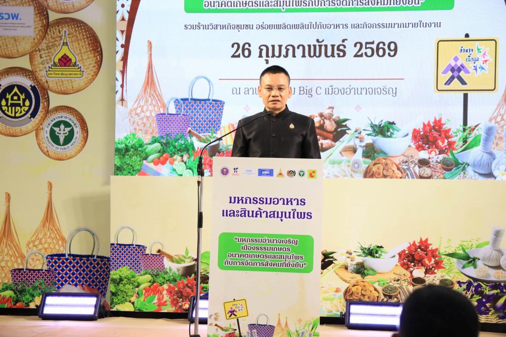 ทีมนักวิจัย มหาวิทยาลัยอุบลราชธานีจัดงานมหกรรมเมืองสมุนไพร จังหวัดอำนาจเจริญ ประจำปี 2569ภายใต้ชื่องาน “มหกรรมอำนาจเจริญเมืองธรรมเกษตร : อนาคตเกษตรและสมุนไพรกับการจัดการสังคมที่ยั่งยืน”ดำเนินงานภายใต้ชุดโครงการการพัฒนาพื้นที่เพื่อแก้ไขปัญหาความยากจนบนฐานเศรษฐกิจชุมชน จังหวัดอำนาจเจริญ ระยะที่ 2 ปีที่ 3 โดยได้รับการสนับสนุนทุนวิจัยจาก หน่วยบริหารและจัดการทุนด้านการพัฒนาระดับพื้นที่(บพท.) โดยมี ผู้ช่วยศาสตราจารย์ ดร.อุทัย อันพิมพ์ คณบดีคณะบริหารศาสตร์ หัวหน้าทีมนักวิจัย กล่าวต้อนรับ รับเกียรติจาก นายไพฑูรย์ พรหมสอน รองผู้ว่าราชการจังหวัดอำนาจเจริญ เป็นประธานเปิดงาน และ ศาสตราจารย์ ดร.ทวนทอง จุฑาเกตุ รองอธิการบดีฝ่ายวิจัยและนวัตกรรม หัวหน้าโครงการวิจัย กล่าวรายงาน ณ ลานกิจกรรม บิ๊กซี ซูเปอร์เซ็นเตอร์ สาขาอำนาจเจริญเมื่อวันที่ 26 กุมภาพันธ์ 2569 ที่ผ่านมา