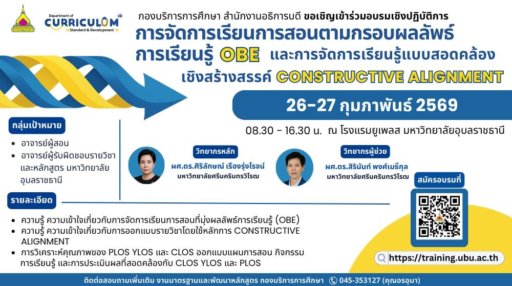งานมาตรฐานและพัฒนาหลักสูตร กองบริการการศึกษา ขอเชิญคณาจารย์มหาวิทยาลัยอุบลราชธานี เข้าร่วมโครงการอบรมเชิงปฏิบัติการ เรื่อง การจัดการเรียนการสอนตามกรอบผลลัพธ์การเรียนรู้ (OBE) และการจัดการเรียนรู้แบบสอดคล้องเชิงสร้างสรรค์ (Constructive Alignment) ในระหว่างวันที่ 26-27 กุมภาพันธ์ 2569 เวลา 08.30 – 16.30 น. ณ ห้องประชุมบอลรูม C ชั้น 2 สถานปฏิบัติการโรงแรมและการท่องเที่ยว (โรงแรมยูเพลส) สามารถ