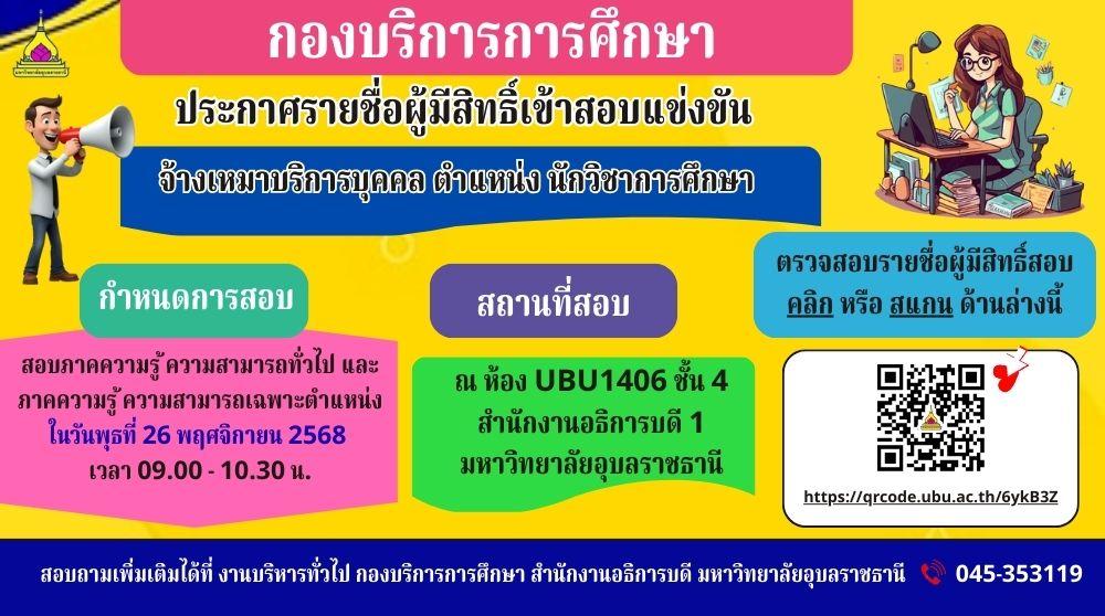 ประกาศรายชื่อผู้มีสิทธิ์เข้าสอบแข่งขัน เพื่อบรรจุเป็นบุคคลจ้างเหมาบริการ ตำแหน่ง นักวิชาการศึกษา สังกัดกองบริการการศึกษา สำนักงานอธิการบดี มหาวิทยาลัยอุบลราชธานี 24 พฤศจิกายน 2568