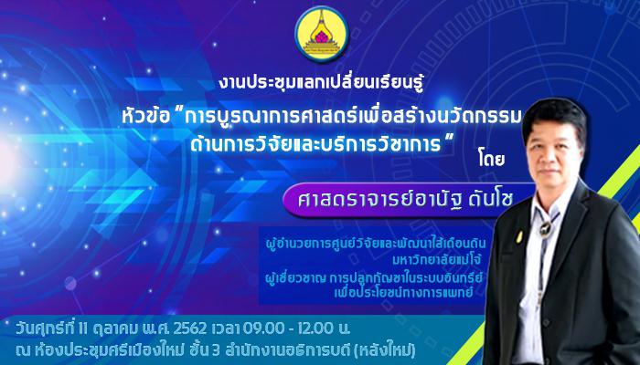 การประชุมแลกเปลี่ยนเรียนรู้ หัวข้อ"การบูรณาการศาสตร์เพื่อสร้างนวัตกรรม ด้านการวิจัยและบริการวิชาการ" วันศุกร์ที่ 11 ตุลาคม พ.ศ.2562