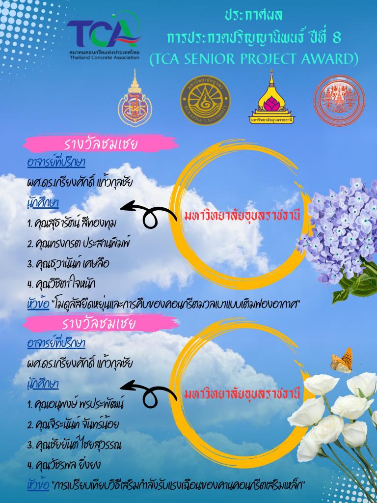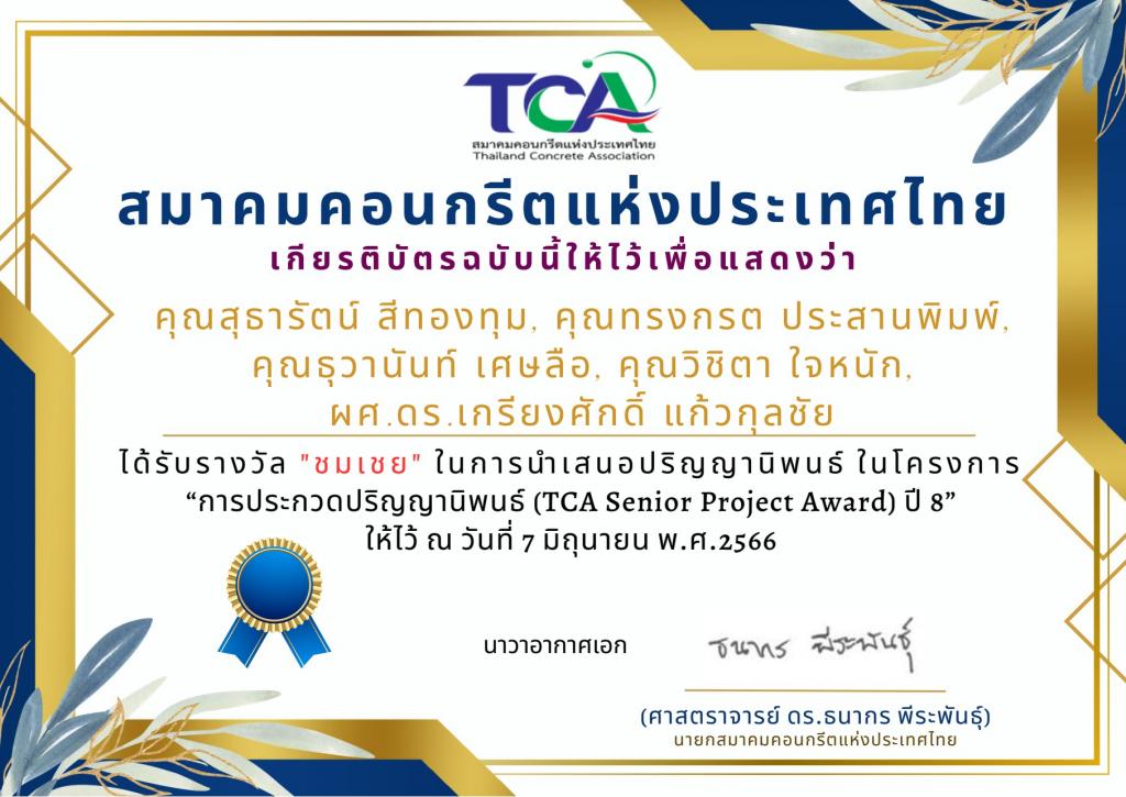 ขอแสดงความยินดีกับนักศึกษาภาควิชาวิศวกรรมโยธาที่ได้รับรางวัลชมเชย 2 รางวัล จากโครงการประกวดปริญญานิพนธ์ (TCA-Senior Project Award) ปีที่ 8 พ.ศ.2566 จัดขึ้นโดย สมาคมคอนกรีตแห่งประเทศไทย(TCA, Thailand Concrete Association) ในว้นที่ 7 มิถุนายน 2566 โดยมีรายละเอียดดังนี้