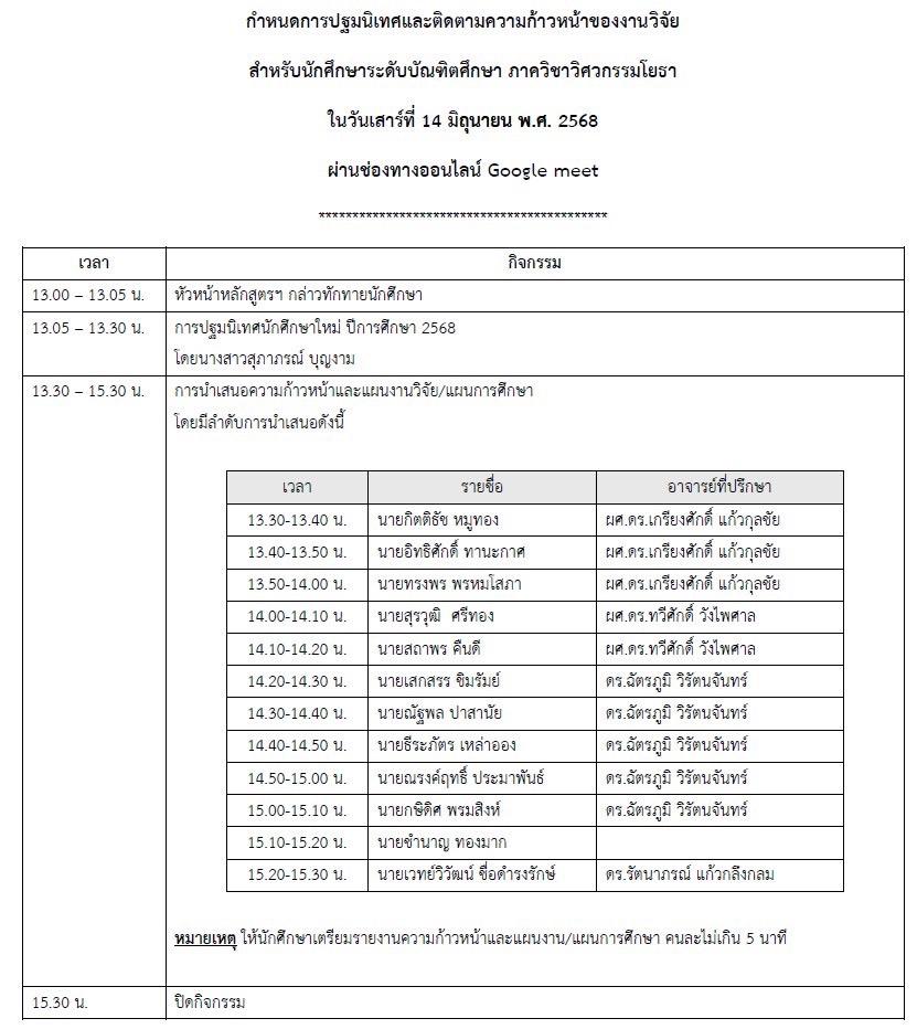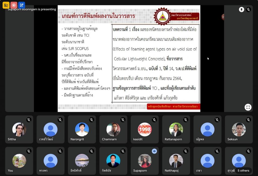 หลักสูตรบัณฑิตศึกษา สาขาวิศวกรรมโยธาได้จัดกิจกรรมโครงการปฐมนิเทศ และนำเสนอแผนการเรียน/วิจัย ระดับบัณฑิตศึกษา ภาคการศึกษาต้น ปีการศึกษา 2568 สาขาวิชาวิศวกรรมโยธา ให้แก่นักศึกษาระดับบัณฑิตศึกษาของหลักสูตรเพื่อปฐมนิเทศหลักสูตรบัณฑิตศึกษา และเป็นการกำกับและติดตามความก้าวหน้าในการทำวิทยานิพนธ์และการแลกเปลี่ยนประสบการณ์ระหว่างอาจารย์ นักศึกษาและบัณฑิต โดยกิจกรรมนี้ได้จัดขึ้นผ่านระบบออนไลน์ google meet ในวันเสาร์ที่ 14 มิถุนายน พ.ศ. 2568