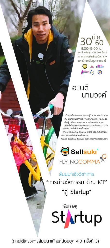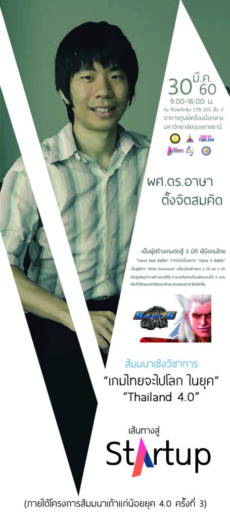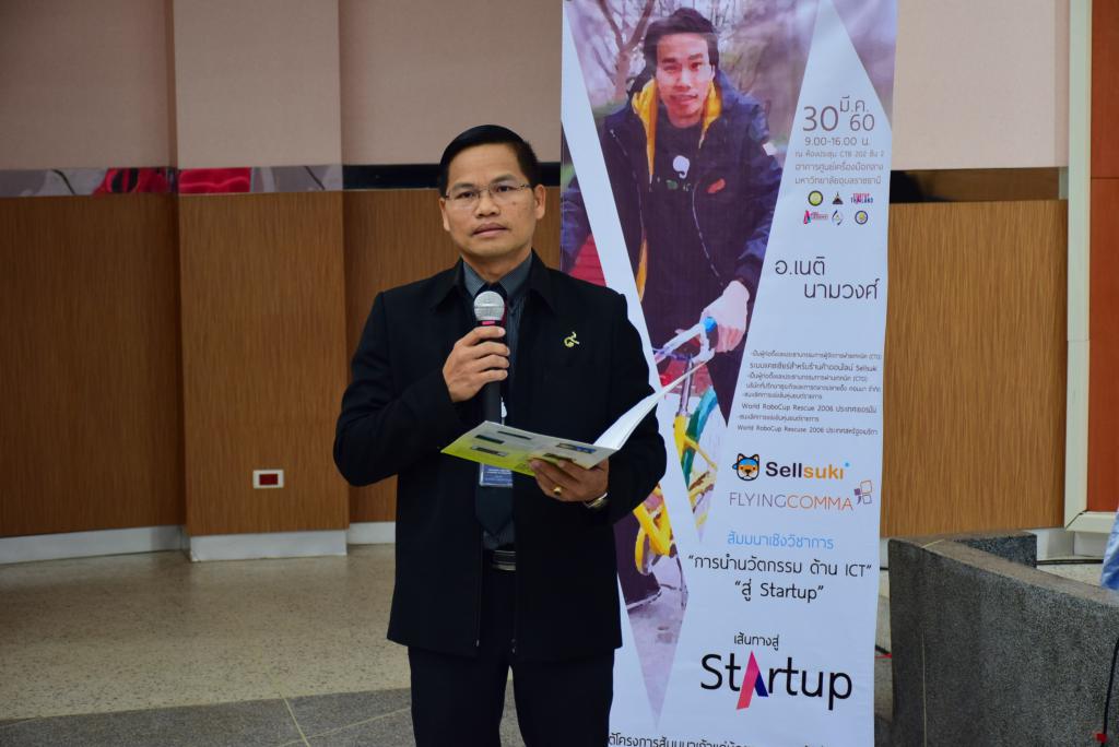 เมื่อวันพฤหัสบดีที่ 30 มีนาคม 2560 สาขาเทคโนโลยีสารสนเทศ คณะวิทยาศาสตร์ มหาวิทยาลัยอุบลราชธานี จัดโครงการเชิญวิทยากรผู้เชี่ยวชาญบรรยายพิเศษด้านเทคโนโลยีสารสนเทศ สัมมนาเชิงวิชาการ ภายใต้หัวข้อ “เส้นทางสู่ Startup” และได้รับการสนับสนุนงบประมาณจัดการสัมมนาเชิงวิชาการจาก อุทยานวิทยาศาสตร์ มหาวิทยาลัยอุบลราชธานี ภายใต้ “โครงการสัมมนาเถ้าแก่น้อยยุค 4.0 ครั้งที่ 3” โดยมี นายอนุพงษ์ รัฐิรมย์ รองคณบดีฝ่ายเทคโนโลยีสารสนเทศ คณะวิทยาศาสตร์ มหาวิทยาลัยอุบลราชธานี เป็นประธานกล่าวเปิดการสัมมนา และ ดร.สมปอง เวฬุวนาธร อาจารย์ประจำหลักสูตรวิทยาศาสตรมหาบัณฑิต สาขาเทคโนโลยีสารสนเทศ คณะวิทยาศาสตร์ มหาวิทยาลัยอุบลราชธานี กล่าวรายงานและวัตถุประสงค์การจัดโครงการครั้งนี้ เพื่อให้นักเรียนและบุคลากรด้านเทคโนโลยีสารสนเทศได้มีโอกาสเรียนรู้ในด้านวิชาการจากผู้เชี่ยวชาญภายนอก และเพื่อเป็นการพัฒนาทักษะให้แก่ อาจารย์ บุคลากร นักศึกษา และผู้ที่สนใจเข้ารับฟังการบรรยายครั้งนี้ เพื่อเตรียมความพร้อมต่อการพัฒนามหาวิทยาลัยในยุคที่มีการเปลี่ยนแปลงอย่างรวดเร็ว และการส่งเสริมการวิจัย การสร้างนวัตกรรม เพื่อให้เกิดองค์ความรู้ใหม่และผลงานสร้างสรรค์ที่สามารถนำไปใช้เพิ่มขีดความสามารถของชุมชนในท้องถิ่น และประเทศให้อยู่ได้อย่างมีความสุขสอดคล้องกับการประกันคุณภาพการศึกษา องค์ประกอบที่ 2.6 ระบบและกลไกลการจัดการเรียนการสอน เกณฑ์ ข้อ 4 มีการให้ผู้มีประสบการณ์ทางวิชาการหรือวิชาชีพจากหน่วยงานหรือชุมชนภายนอกเข้ามามีส่วนร่วมในกระบวนการเรียนการสอนทุกหลักสูตรในอนาคต สำหรับการสัมมนาเชิงวิชาการครั้งนี้ ได้รับเกียรติจาก ผู้ช่วยศาสตราจารย์ ดร.อาษา ตั้งจิตสมคิด เป็นผู้สร้างเกมต่อสู้ 3 มิติ ฝีมือคนไทย “Saros Real Battle” ภาคต่อเนื่องจาก “Zaros X Battle” เป็นผู้สร้าง “ARSA Framework” เครื่องมือสร้างเกม 2 มิติ และ 3 มิติ เป็นผู้เขียนตำราเกมซีรี่ย์ ทะลวงถึงแก่นเรื่องเขียนเกมทั้ง 4 ตอน และเป็นที่ปรึกษาแผนกวิจัยและพัฒนาเกมของอาษาโปรดักชั่น บรรยายพิเศษ หัวข้อ “ธุรกิจเกมส์” และ นายเนติ นามวงศ์ เป็นผู้ก่อตั้งและประธานกรรมการผู้จัดการฝ่ายเทคนิค(CTO)ระบบแคชเชียร์สำหรับร้านค้าออนไลน์ Sellsuki เป็นผู้ก่อตั้งและประธานกรรมการฝ่ายเทคนิค (CTO)บริษัทที่ปรึกษาธุรกิจและการตลาดปลายอิ้ง คอมมา จำกัด และชนะเลิศการแข่งขันหุ่นยนต์รายการ World RoboCup Rescue 2006 จากประเทศเยอรมัน และประเทศสหรัฐอเมริกา บรรยายพิเศษ หัวข้อ "การนำนวัตกรรมด้านICT สู่ Startup” และการเสวนา หัวข้อ “เส้นทางสู่ Startup จากนักวิชาการสู่นั