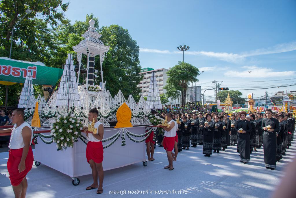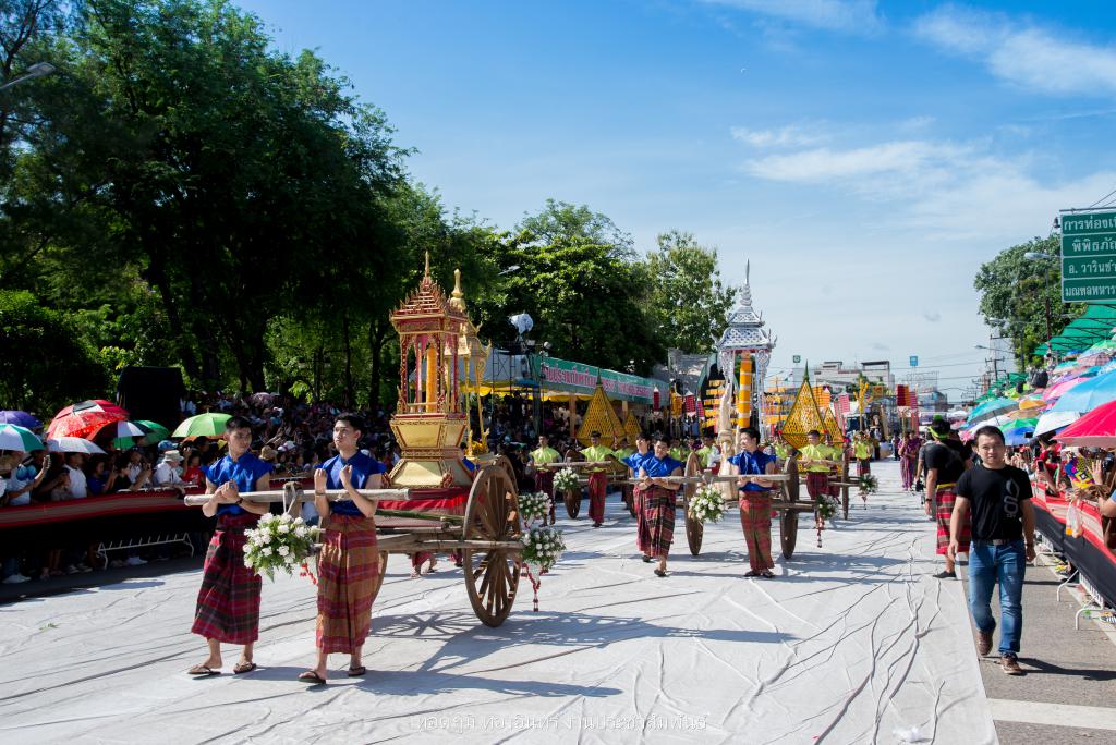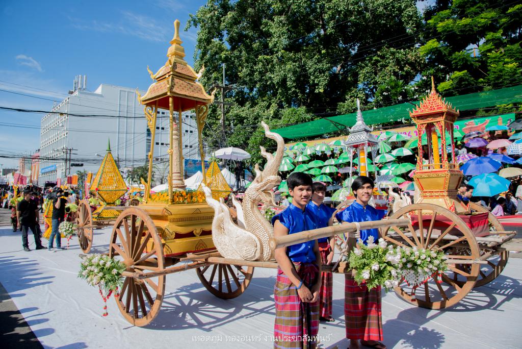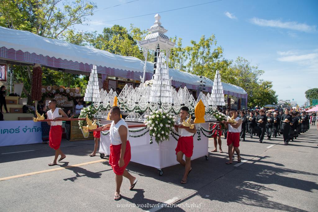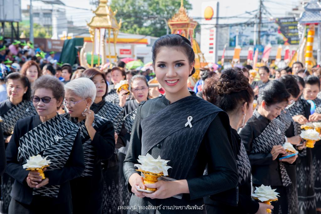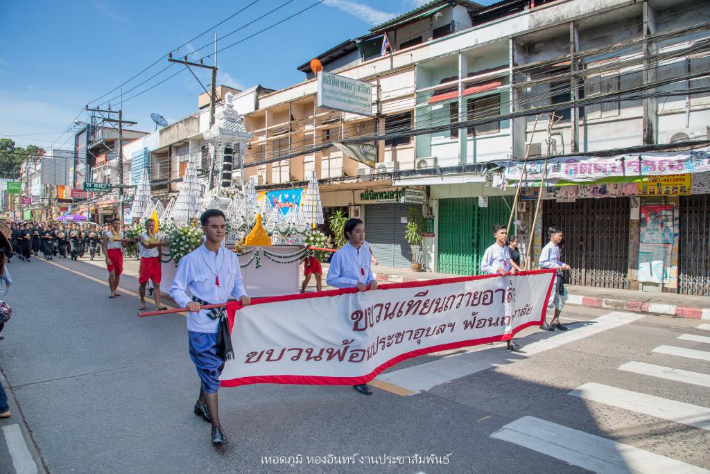 ซึ่งการจัดทำขบวนเทียนถวายอาลัย ประกอบไปด้วย บุษบกเทียนแบบศิลปะล้านช้าง ขนาด 1.20 เมตร ยาว 1.20 เมตร สูง 1.80 เมตร พร้อมเทียนมัดรวมแบบศิลปะอุบล ขนาดเส้นผ่าศูนย์กลาง 1 ฟุต สูง 1.20 เมตร ตกแต่งลายเทียนติดพิมพ์สีขาว ในโครงสร้างภาพรวมเน้นโทนสีดำ-สีขาว จัดทำส่วนประกอบตกแต่ง ประกอบด้วยผาสารทผึ้ง ฐานดอกบัวอุบล จำนวน 15 ชุด โครงสร้างไม้ไผ่สาน ทาสีดำติดขอบด้วยผ้าขาวพับกลีบรูปแบบจับจีบลายใบตอง พร้อมฉัตรเทียน 9 ชั้น จำนวน 4 ชุด ตกแต่งด้วยมาลัยดอกรักประดิษฐ์ ขนาด 4 x 4 เมตร พร้อมขบวนดอกไม้จันทน์ จำนวน 89 คน จาก ชมรมผู้สูงอายุ สโมสรไลออน และเหล่ากาชาดอุบลฯ เพื่อแสดงออกถึงความอาลัย และแสดงความจงรักภักดีพร้อมน้อมรำลึกถึงพระมหากรุณาธิคุณอันหาที่สุดมิได้ ของพระบาทสมเด็จพระปรมินทรมหาภูมิพลอดุลยเดช รัชการที่ 9
